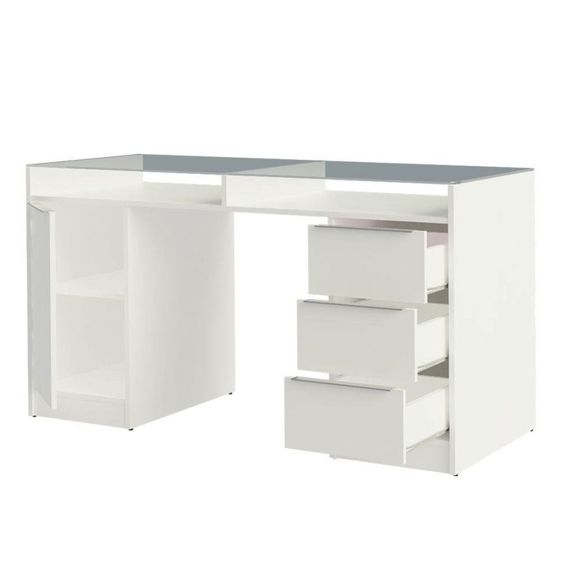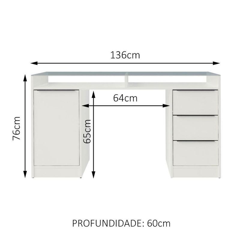 Escrivaninha 1 Porta E 3 Gavetas Madesa Chicago - Branco Ambiente: Home OfficeCor: BrancoGarantia: 3 Meses Contra Defeitos de FabricaçãoMaterial: MdpPeso Aproximado: 54,6 KgPeso Suportado: 5 Kg Sobre O. TampoDimensões - Largura: 136 CmTipo: Mesa de EscritórioTonalidade: BrancoProduto: EscrivaninhaDimensões - Altura: 76 CmCômodo Indicado: EscritórioMarca: MadesaTempo de do Fornecedor (dias): 1Estado de Origem: RsMaterial Para Filtro: MdpConteúdo da Embalagem: N/iInstruções/cuidados: N/iDimensões - Profundidade: 60 Cm Na hora do trabalho ou do estudo, nada como ter um cantinho aconchegante para deixar você mais confortável. A Escrivaninha Madesa Chicago é a escolha perfeita para o seu quarto ou escritório.O tampo de vidro é um diferencial que agrega beleza e resistência ao móvel. Conta com 1 porta convencional e 3 gavetas com corrediças metálicas, permitindo uma ótima organização de materiais como cadernos, livros, pastas e o que mais você quiser. Além disso, possui 2 nichos abaixo do tampo, otimizando ainda mais o espaço útil. Também pode ser usada como mesa de apoio ou para e .Possui acabamento branco, feito em Pintura Poliéster de alta resistência, exclusiva e patenteada. Consiste na aplicação de 7 camadas de proteção resistentes a álcool, água e calor. A pintura é ecológica, isenta de vapores que vão para a atmosfera. A parte exterior das costas não possui pintura.(Imagem meramente ilustrativa. A cadeira e todos os outros objetos decorativos não acompanham o produto.)Dimensões do produto: 76 cm de altura x 136 cm de largura x 60 cm de profundidade.Código do produto: 6912093Obs.: A Madesa não disponibiliza serviço de montagem. O produto segue com manual de instalação e todas as ferragens necessárias para sua montagem.1-O produto é ou ?R.: Todos os produtos da Madesa são novos, enviados da nossa fábrica diretamente para as casas de nossos clientes.2-O produto vem montado? Se não, vocês realizam a montagem?R.: A Madesa não disponibiliza serviço de montagem. Todos os produtos seguem com manual de instalação e as ferragens necessárias. Alguns produtos possuem vídeo explicando o passo a passo da montagem.3-Vocês possuem física? Posso retirar meu produto em mãos?R.: Não possuímos física, apenas virtual. Confira as opções de ao colocar o seu CEP.4-Qual é o valor do ? Posso pagar separadamente?R.: O valor do é calculado com base no peso e volume do produto, e no CEP de destino. Você pode calcular o valor e prazo de no simulador.5-A Madesa em ? Como é feita a ?R.: Sim, entregamos no inteiro através de transportadoras parceiras.6-O produto acompanha ?R.: Sim, todos os produtos são entregues com suas respectivas .7-Os produtos possuem garantia?R.: Sim. A Madesa oferece 3 meses de garantia para defeitos de fabricação.Marca :MADESA -Referência :6912093Garantia :3 Meses de Garantia ( Garantia de 3 meses contra de fabricação )