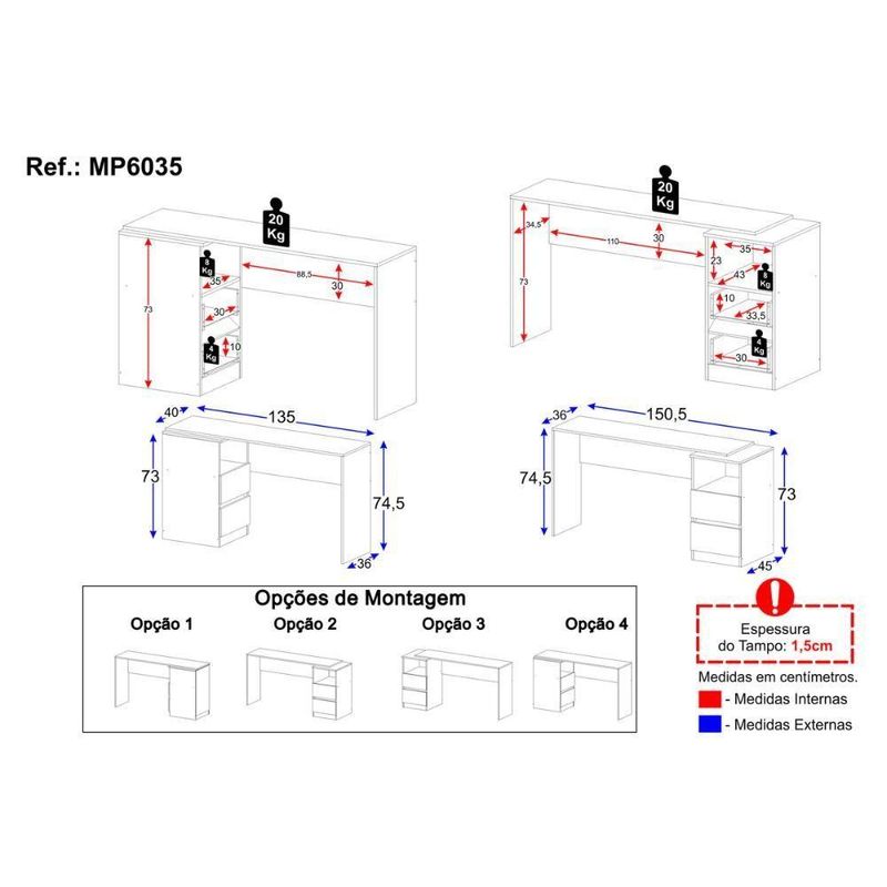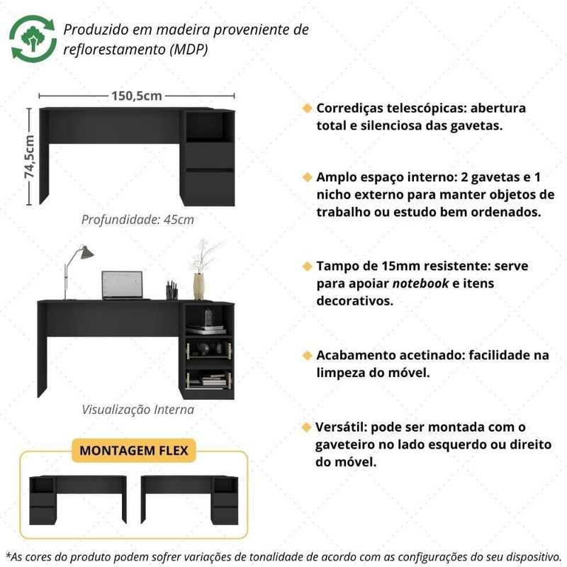 Escrivaninha 150,5cm Com Nicho E 2 Gavetas Flex Multimóveis MP6035 PretoDê um novo significado ao seu cantinho de trabalho ou estudos com a Escrivaninha 150,5cm com Nicho e 2 Gavetas Flex Multimóveis MP6035. Com design moderno e funcional, ela combina amplitude, organização e elegância em um único móvel. Seja para home office, quarto ou escritório, sua estrutura robusta e o visual contemporâneo tornam o ambiente mais produtivo e acolhedor, ajudando você a manter tudo sempre ao alcance das mãos com muito estilo.Diferenciais:- Durável e sustentável: produzida em MDP 15mm (proveniente de reflorestamento) com acabamento acetinado (cerca de 20% de brilho).- Montagem flex: o gaveteiro pode ser montado no lado esquerdo ou direito, virado para a frente ou para a lateral.- 2 gavetas: organização eficiente de objetos e documentos, suportando até 4kg cada.- Corrediças telescópicas: possibilitam a abertura total, suave e silenciosa das gavetas.- Nicho externo: perfeito para acomodar livros ou itens que precisam estar sempre por perto.- Tampo resistente: suporta até 20kg, possuindo amplo espaço para seu momento de trabalho ou estudo.Conteúdo da Embalagem:1 (uma) EscrivaninhaManual de MontagemKit FerragemDimensões do Produto Montado:Altura: 74,5cm | Largura: 150,5cm | Profundidade: 45cm*Você pode consultar as medidas detalhadas na imagem técnica do produto.Observações Importantes:*As cores do produto podem sofrer variações de tonalidade de acordo com as configurações do seu dispositivo.*Imagens meramente ilustrativas (decoração e eletrônicos não inclusos).*O produto será entregue desmontado e não disponibilizamos o serviço de montagem. Acabamento: Finish Foil | Tonalidade: Branco | Material: MDP | Referência do Modelo: MP6035 | Coleção: Escrivaninha | Instruções de Cuidado: Limpar com pano seco para retirar o pó. Não utilizar produtos químicos ou abrasivos a limpeza. Não aplicar lustra móveis. | Sistema de Montagem: O produto acompanha manual de montagem juntamente com kit ferragem. O produto será entregue desmontado e não disponibilizamos o serviço de montagem. | Produto Composto por: 1 escrivaninha, manual de montagem e kit ferragem. | Altura Montado: 74.5 | Largura Montado: 150.5 | Profundidade Montado: 45 | Tamanho (L x A x P): 150,5 x 74,5 x 45 | Peso do Produto: 26 | Garantia do Fabricante: 3 | Fabricante: Multimóveis | Requer Montagem: Sim | Produto: Conjunto de Escritório | Prateleiras: 0 | Gavetas: 2 | Com Gavetas: Sim | É em forma de L: Não | É Gamer: Não | Altura (cm): 74,5 cm | Comprimento (cm): N/A | Largura (cm): 150,5 cm | Profundidade (cm): 45 cm | Material da mesa: MDP | Com luzes led: Não | Materiais da escrivaninha: MDP | Destaque 1: Produzida em MDP: maior durabilidade e resistência. | Destaque 2: 2 gavetas com corrediças telescópicas: abertura total e silenciosa. | Destaque 3: Flex: pode ser montada com o gaveteiro no lado esquerdo ou direito. | Inclui estante para livros: Não | Destaque 4: Tamanho do produto montado (L x A x P): 150,5 x 74,5 x 45 cm | É flutuante: Não | Destaque 5: Design clean: ambiente mais moderno e belo. | Estilo: Moderno | Peso (kg): 26 kg | Tempo de montagem: N/A | Capacidade em peso: N/A | Inclui manual de instruções: Sim | Quantidade de caixas de embalagem: 02 | Marca: Multimóveis | Baterias são necessárias?: Não | Peso do item: unit=kilograms;value=26 | Certificação de teste externa: Não aplicável | Dimensões do item P x L x A: depth#value=45;depth#unit=centimeters;width#value=150.5;width#unit=centimeters;height#value=74.5;height#unit=centimeters | Quantidade de itens: 1 | Número da peça: MP6035.697 | Tipo de Garantia: Garantia do Fabricante | Componentes incluídos: Mesa Auxiliar | Montagem: Necessita Montagem | País de Origem: Brasil | Palavras-chave: mesas l de escritorio, escrivaninha para quarto, mesa para escritorio em l, mesa de escritorio em l, mesa escritorio com gaveteiro, escrivaninha estante, estacao de trabalho em l, mesa de escritorio, mesa computador, mesa escritorio l | Inclui manual de montagem: Sim | Cor: Preto