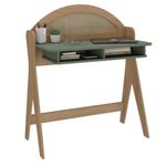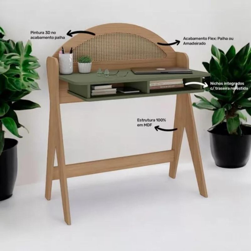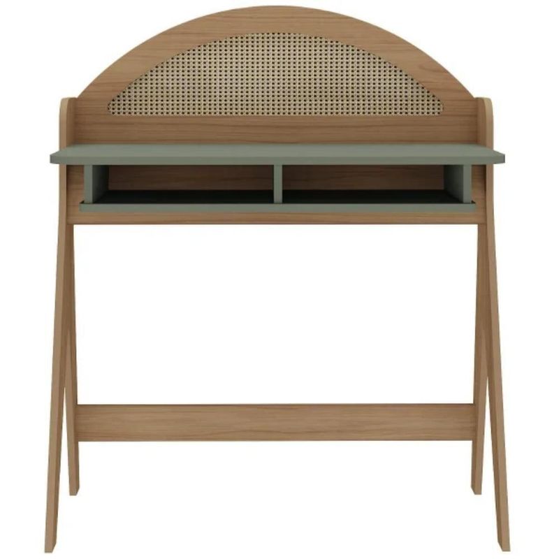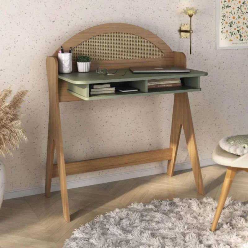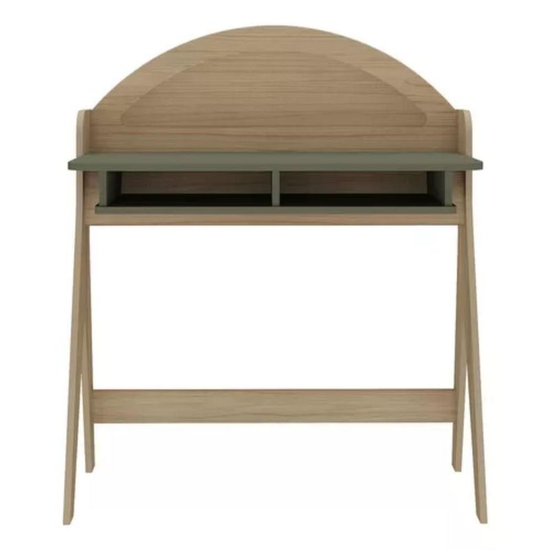 Escrivaninha 2 Nicho Em Mdf Ceci Carvalho E Verde MentaA Escrivaninha Ceci é a escolha perfeita para transformar seu ambiente em um refúgio de inspiração. Seu design delicado e sofisticado, com traços curvos e detalhes bem trabalhados, combina elegância e funcionalidade em uma única peça. Fabricada 100% em MDF para maior durabilidade, seu acabamento com pintura 3D para um visual sofisticado e Pés estáveis em MDF, garantindo resistência.O destaque visual fica por conta do painel arredondado com pintura 3D no acabamento palha, que adiciona um toque exclusivo e aconchegante à decoração. Além da estética diferenciada, a Escrivaninha Ceci oferece praticidade com seus dois nichos estrategicamente posicionados garantem espaço extra para organizar livros, materiais de estudo ou objetos decorativos, mantendo tudo sempre ao seu alcance.Versátil e charmosa, ela pode ser usada como escrivaninha para trabalho e estudo ou até mesmo como penteadeira, agregando estilo e funcionalidade ao seu espaço.ESPECIFICAÇÕES TÉCNICAS:- Material: MDF;- Acabamento: Pintura 3D;- de Portas: Não Possui;- de Gavetas: Não Possui;- de Nichos: 2 Nichos- Possui Prateleiras? Não;- Possui LED? Não;- Possui Pés? Sim;- Material dos Pés: MDF;- Produto precisa de montagem? Sim;- Garantia: 3 Meses Contra de fabricação;- Medidas: LarguraxProfundidadexAltura; 90x53x107cm;Observações importantes:Imagens meramente ilustrativas, produto não acompanha objetos de decoração e eletrônicos;O produto pode sofrer alterações de tonalidade conforme o seu monitor;Produto não deve ficar exposto diretamente ao sol, calor e umidade excessivas;Recomendações de Limpeza: Utilize somente pano seco ou levemente umedecido;Ao receber, verifique a embalagem. Se detectar irregularidade recuse o e nos contate.Não nos responsabilizamos, no ato da , por subir escadas/elevadores, guinchos, içamentos ou quaisquer outros meios específicos de .Nós não nos responsabilizamos pela montagem e por problemas causados pela montagem realizada por você ou montador contratado. Material: MDF | Cor: Verde | Acabamento: Pintura 3D no acabamento palha | Marca: Artely | Possui Vidro: Não | Material do Tampo: MDF | Possui Pés: Sim | Material dos Pés: MDF | Possui Portas: Não | Possui Gavetas: Não | Possui Nichos: Sim | Possui Prateleiras: Não | Altura (cm): 107 | Largura (cm): 90 | Profundidade (cm): 53 | Modelo: Ceci | Garantia: 90 dias | Requer montagem: Sim | Quantidade de caixas de embalagem: 1 | Comprimento: 53 | Materiais da escrivaninha: Madeira | É em forma de L: Não