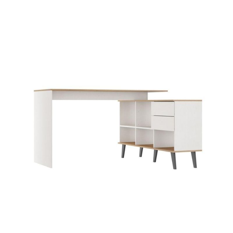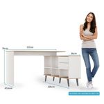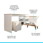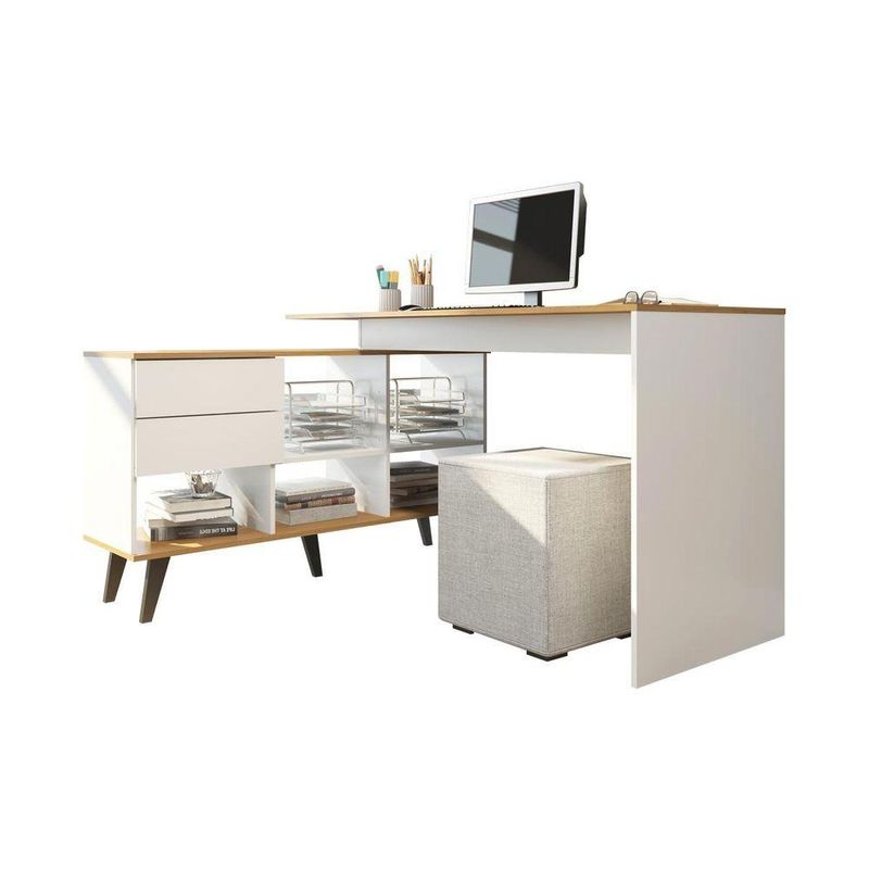 Escrivaninha De Canto Home Office 2 Gavetas E Nichos Menu Móveis Branco/carvalhoA Mesa Escrivaninha é um móvel útil e versátil que promete ser o protagonista do seu ambiente. Dispõe de um design atual que facilita na hora de montar a decoração, proporcionando um espaço mais aconchegante e organizado. Possui tampo espaçoso, perfeito para o home office, além de estante lateral com duas gavetas e nichos para armazenar seu material de uso diário. O destaque fica por conta dos pés retrô, dando um toque único ao móvel. Além de sua montagem flex que permite montar a estante nos dois lados, se adequando ao espaço disponível. A mesa é produzida com materiais de excelente qualidade, garantindo a sua durabilidade. O melhor em móveis no design atual aliando conforto, qualidade e ótimos preços, só na Menu Móveis!CARACTERÍSTICAS TÉCNICAS:- Produzida em MDP de 15 mm- Acabamento UV na cor Branco e Carvalho Dakar- Gavetas com Corrediça Metálica- Puxadores tipo Cava Lateral- Pés Retrô em Madeira com 18 cm na cor Preto*A mesa pode ser montada nos dois lados.INFORMAÇÕES TÉCNICAS:Altura Mesa: 76 cmAltura Estante: 65 cmLargura Mesa: 137 cmLargura Estante: 128 cmProfundidade Mesa: 45,6 cmProfundidade Estante: 36 cmPeso: 41,5 kgINFORMAÇÕES ADICIONAIS:- ATENÇÃO: Não trabalhamos e não nos responsabilizamos pela montagem do móvel. Antes da montagem conferir se o produto está de acordo com o que comprou, produto montado e danificado pela montagem não será aceito troca. Montagem e instalação por conta do comprador.- As imagens ambientadas são meramente ilustrativas e podem apresentar itens que não compõe o produto. As cores do produto podem variar de acordo com o monitor, a iluminação do ambiente ou sua percepção visual.- Limpeza: Deve ser feita com pano macio e seco ou levemente umedecido com água e sabão neutro. Não devem ser utilizados abrasivos como palha de aço e objetos cortantes.Garantia para defeitos de fabricação conforme Código de Defesa do Consumidor.Menu Móveis