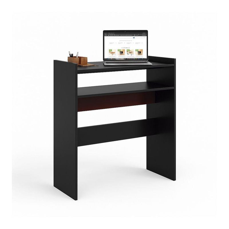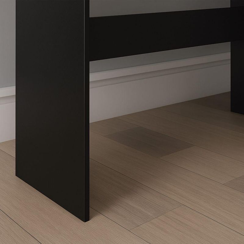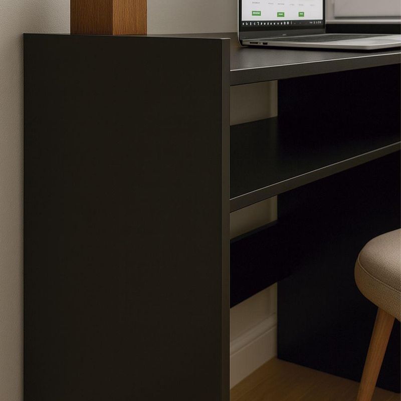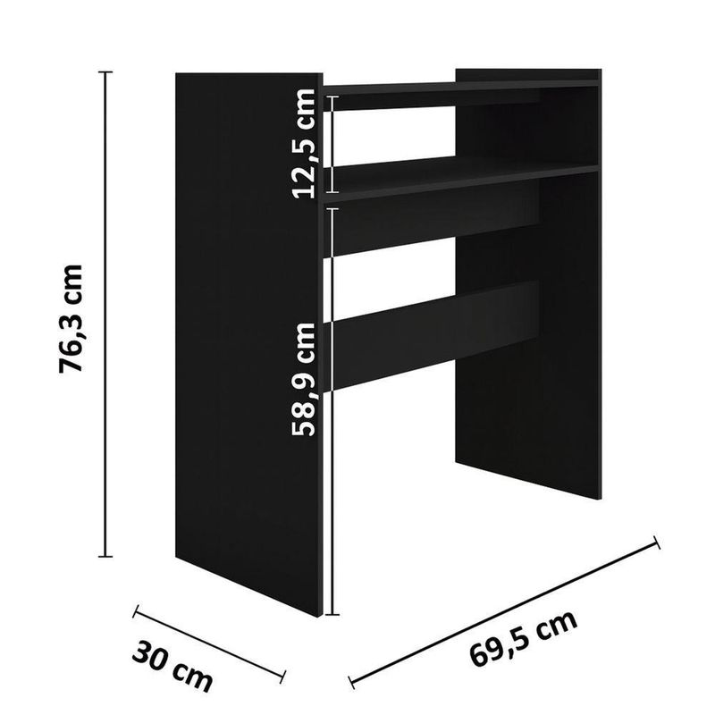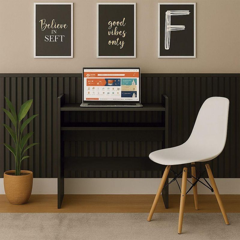 Escrivaninha Nail - Moveisaqui Cor (principal) PretoCom design moderno e estrutura prática, a Escrivaninha Nail é a opção ideal para quem busca funcionalidade e estilo em um só móvel.Seu tampo amplo oferece espaço suficiente para notebooks, livros e materiais de trabalho, garantindo praticidade para as rotinas do dia a dia.Além disso, o modelo conta com nichos laterais bem distribuídos, perfeitos para organizar documentos, objetos decorativos ou itens de escritório.A estrutura firme e o acabamento refinado proporcionam durabilidade, enquanto o design clean facilita a combinação com diferentes ambientes, desde home offices até quartos e salas de estudo.Dimensões:Altura: 76,3cmLargura: 69,5cmProfundidade: 30cmObservações:- Tampo espaçoso para estudos e trabalho- Nichos laterais para organização e praticidade- Estrutura firme e acabamento de alto padrão- Design moderno, clean e versátil- Ideal para home office, quartos e salas de estudo
