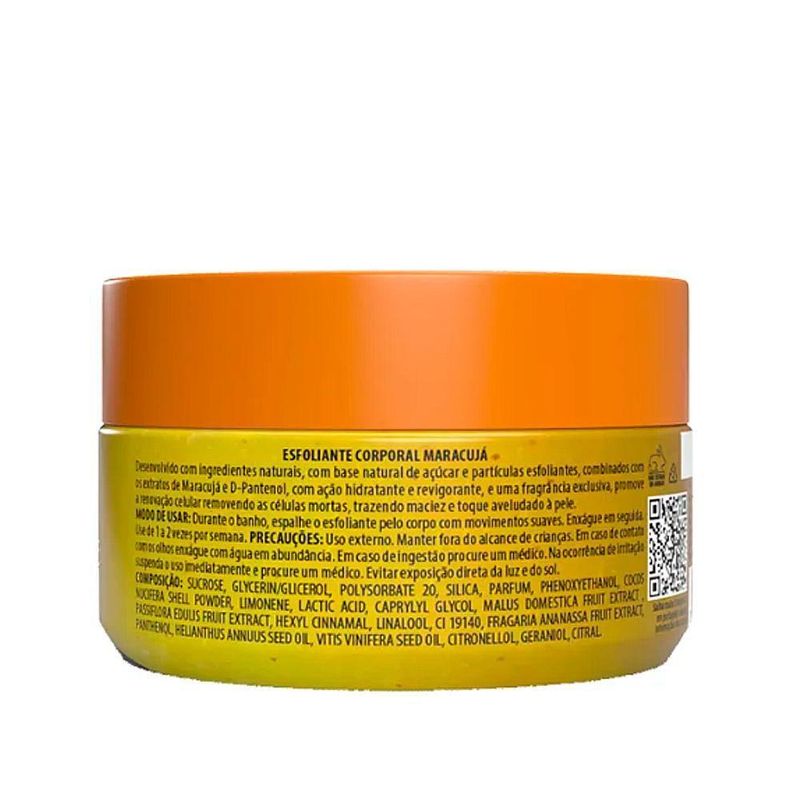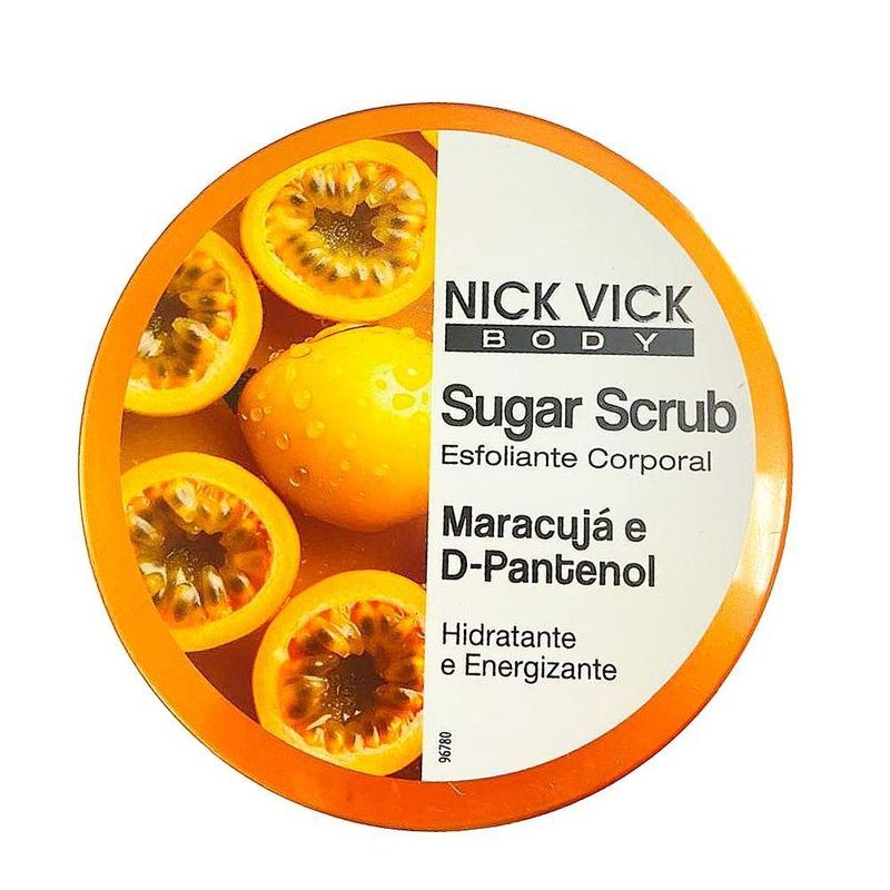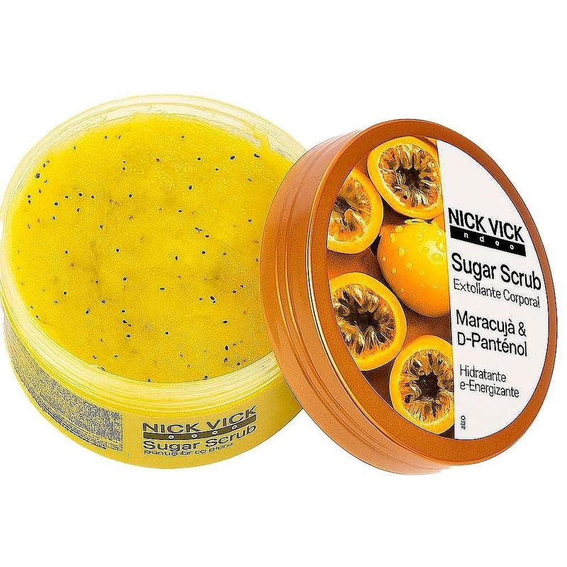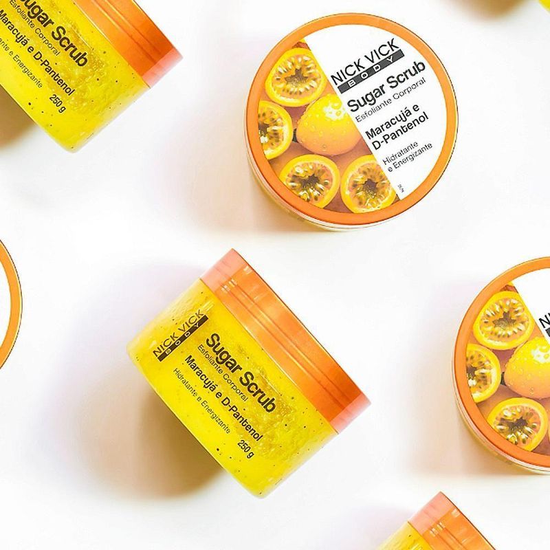 Esfoliante Corporal Sugar Scrub Nick Vick Body Maracujá 250gESFOLIANTE MARACUJÁ E D-PANTENOLPele renovada, hidratada e com toque sedoso!O Sugar Scrub Maracujá da Nick Vick é o esfoliante corporal ideal para quem busca cuidados naturais e eficazes.Desenvolvido com ingredientes naturais, com base natural de açúcar e partículas esfoliantes, combinados com os ativos Frutas Vermelhas e Extrato de Maracujá, e uma fragrância exclusiva, trazem energia e frescor, promovendo uma esfoliação com hidratação, removendo as células mortas, resultando em maciez e toque aveludado à pele.Traz ao seu banho a sensação de limpeza sem agredir sua pele.Sem ingredientes de origem animal. Sem sulfatos, parabenos, petrolatos e óleo mineral.Ativos:- Extrato de Morango – possui propriedades hidratante, adstringente, refrescante, suavizante, remineralizante e reestruturante da pele.- Extrato de Maracujá – hidratante, suavizante e refrescante.- Glicerina – funciona como um hidratante e umectante. Mantém a pele hidratada e protege do ressecamento.- D-Pantenol - hidratante profundo, ação antiinflamatória, curativa e reepitalizante (regeneração e cicatrização do tecido epitelial).Principais Benefícios:- Esfoliação suave com açúcar natural- Hidratação intensa com D-Pantenol e Glicerina- Nutrição com Óleo de Rosa Mosqueta- Fragrância relaxante de Maracujá- Fórmula vegana e livre de sulfatos, parabenos e petrolatosModo de uso:Aplique sobre a pele úmida, massageie em movimentos circulares e enxágue. Use 2 a 3 vezes por semana para melhores resultados.Ideal para: - Todos os tipos de pele - Rotinas de autocuidado - Quem busca produtos veganos e naturaisCompre agora e transforme seu banho em um momento de spa com o Esfoliante Corporal Sugar Scrub Nick Vick Body Maracujá 250g!Composição em português:Sacarose, Glicerol, Polissorbato 20, Sílica, Fragrância, Fenoxietanol, Casca de coco em pó, Limoneno, Ácido láctico, Caprilil glicol, Extrato de maçã, Extrato de maracujá, Hexil cinamal, Linalol, Corante amarelo de tartrazina 19140, Extrato de morango, Pantenol, Óleo de semente de girassol, Óleo de semente de uva, Citronelol, Geraniol, Citral. Ingredient list: Sim