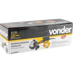 Esmerilhadeira Angular 4.1/2" Eav 650 Com Disco 110V VonderConteúdo Embalagem:1 Esmerilhadeira angular, acompanha: capa de proteção com trava de ajuste rápido, punho auxiliar, chave 2 pinos e 1 disco corte 115,0 mm X 1,0 mm X 22,23 mmDestaques e diferenciais:Possui punho auxiliar com duas posições de fixação que atua como apoio durante o manuseio da ferramenta, adaptando-se a diferentes situações e locais de uso, muitas vezes de difícil acesso. Com estrutura compacta, conta com botão de trava do eixo e dupla isolação, garantindo maior segurança ao operador.Aplicações e dicas de uso:Indicada para corte, desbaste e acabamento em superfícies metálicasCaracterísticas Técnicas:Capacidade da esmerilhadeira (disco): 4.1/2 - 115 mm Potência (W): 650 Rotação (rpm): 11.000/min Rosca do eixo: M 14 Tipo de velocidade: Fixa Número de posições de ajuste do punho: 2 posições Ajuste do cabo da esmerilhadeira: Fixo Tensão (V): 110V~ Segue norma: ABNT NBR IEC 60745-1 e ABNT NBR IEC 60745-2-3Garantia:Garantia legal: 90 dias + Garantia contratual: 9 meses Produto: Esmerilhadeira | Voltagem: 127