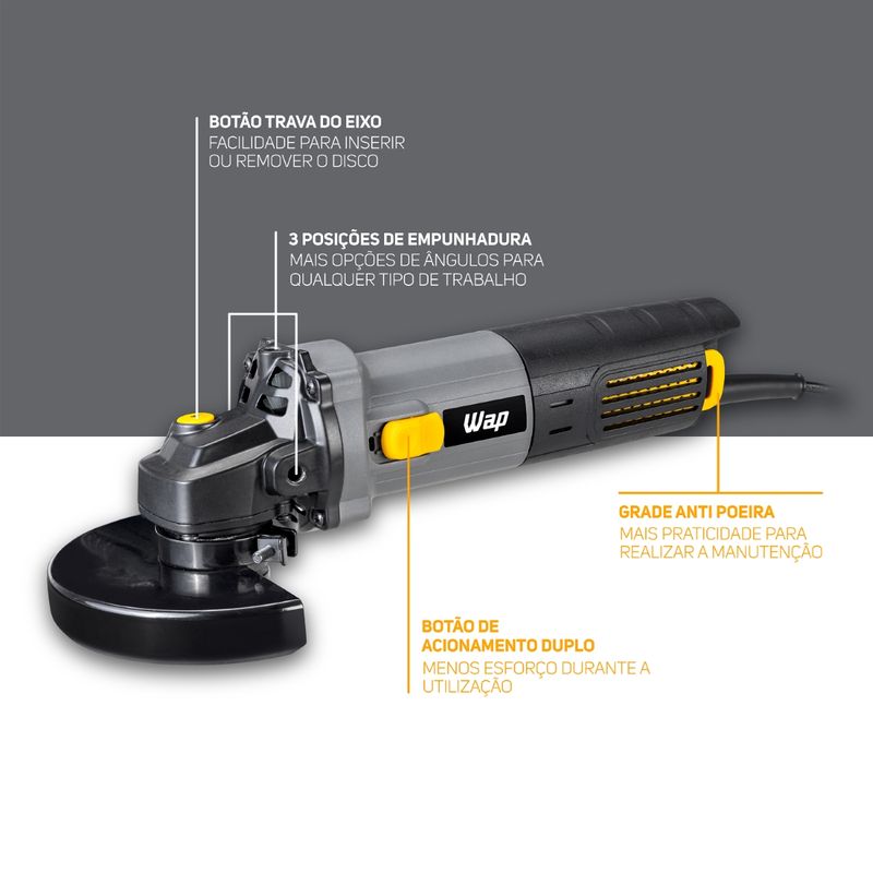 Código do Fornecedor: FW010093 Marca: Wap Conteúdo da embalagem: 1 Esmerilhadeira Angular 5'' 950W 220V WFES01 Wap DADOS TÉCNICOS: POTÊNCIA ELÉTRICA: 950 WTENSÃO: 220VCOR: Amarelo e PretoROTAÇÕES (RPM): 13000DIAMETRO DO DISCO (ømm / ""): 125/5ROSCA DO EIXO: M14COMPRIMENTO DO CORDÃO DE ALIMENTAÇÃO: 1,8mPESO CAIXA MASTER: 19,5 KgPESO LÍQUIDO: 1,7 KgPESO BRUTO: 1,8 KgDIMENSÕES DO PRODUTO (CxLxA): 33,5 x 22 x 11,1 cmGARANTIA: 01 ANO Essencial para enfrentar qualquer desafio de corte e desbaste, a ESMERILHADEIRA ANGULAR 5” WAP WF ES01 é a escolha de confiança para o seu trabalho. Com durabilidade e alto desempenho, ela oferece resultados precisos tanto em projetos profissionais quanto nas tarefas ocasionais. Desenvolvida para proporcionar controle total e menos fadiga durante a utilização, a empunhadura auxiliar da ferramenta conta com três opções de posições, que permitem o manuseio em diferentes perspetivas. Possui 950W de potência para realizar trabalhos que exigem eficiência, sem esforço. Seu botão de acionamento duplo otimiza a uso contínuo sem a necessidade de manter o gatilho pressionado. Com 13.000RPM, o disco giratório se movimenta em alta velocidade para realizar cortes precisos em diferentes materiais, garantindo acabamento de qualidade. A manutenção da ferramenta elétrica é mais fácil com as grades anti-poeira. Esse recurso exclusivo protege o motor contra a entrada de poeira e detritos, prolongando a vida útil da ferramenta, o que mantém seu desempenho em dia por mais tempo. A WAP ESMERILHADEIRA ANG 5"" WF ES01 conta com acessórios que facilitam sua rotina de trabalho. Além da empunhadura auxiliar, você pode usar a chave de troca de disco para ajustar a ferramenta e o protetor de disco, que oferece mais segurança ao desviar faíscas, poeira e detritos durante o uso.