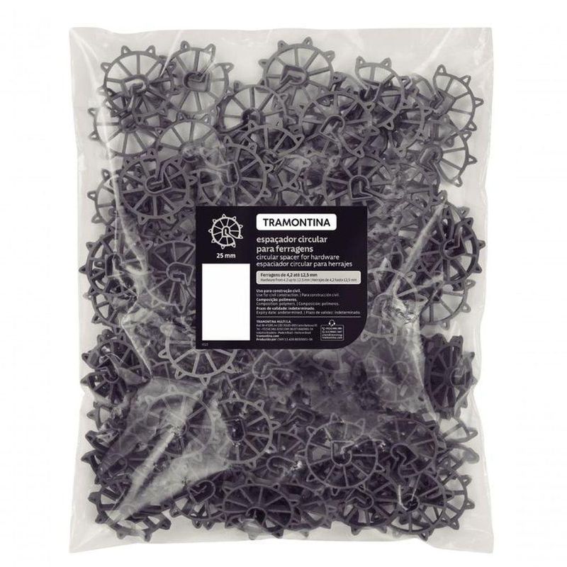 Espaçador Plástico Circular Tramontina Para Ferragens 20mm Saco Com 100 UnidadesO espaçador plástico circular Tramontina 20 milímetros para ferragens é essencial para garantir qualidade e em projetos de construção e concretagem. Desenvolvido para manter o distanciamento correto entre as barras de ferro, ele assegura o cobrimento ideal do concreto, permitindo uma aplicação uniforme e eficiente. Isso contribui diretamente para a resistência, durabilidade e desempenho das estruturas. Prático e fácil de utilizar, é a escolha certa para empreiteiros e profissionais da construção civil que buscam precisão e confiabilidade na execução de obras.Recomendações de Uso:Modo de uso: Utilizado na construção civil, garantindo o cobrimento e posicionamento das ferragens e armaduras. em laterais de vigas, pilares, paredes e pré-moldados. Para descarte dos produtos e embalagens siga as orientações de reciclagem vigentes.- Foto meramente ilustrativa.Informações Adicionais:- Tamanho 20 mm;- Saco com 100 un;- Indicado para ferragens de 4,2 até 12,5 mm;- Fabricado em plástico de alta resistência, proporcionando maior durabilidade e ótimo acabamento.