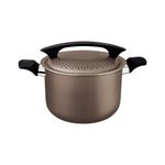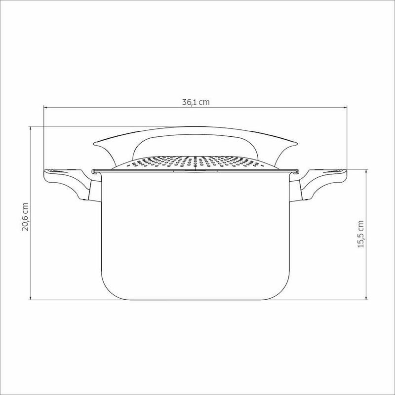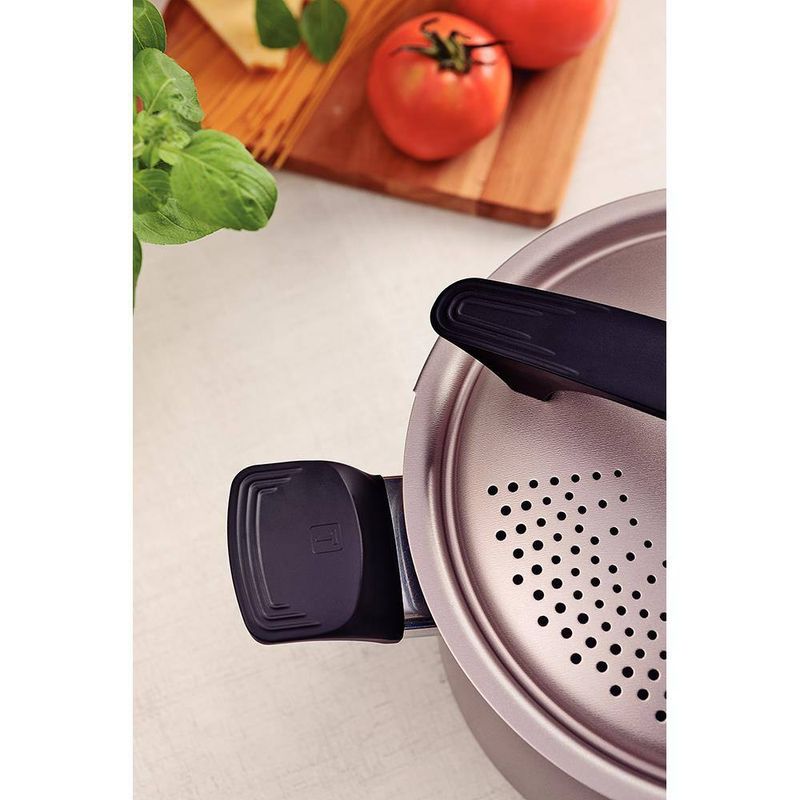 Facilite o preparo de massas e traga mais praticidade à sua cozinha com a Espagueteira Tramontina Milazzo 22cm em Alumínio com Antiaderente Starflon Max. Desenvolvida especialmente para o dia a dia, ela conta com corpo de alumínio com 1,8 mm de espessura e revestimento interno e externo antiaderente Starflon Max, que proporciona cozimento rápido e uniforme, além de facilitar a limpeza ao evitar que os alimentos grudem.Possui alças de baquelite antitérmico com acabamento soft-touch, que oferecem maior segurança e conforto no manuseio. Seu grande diferencial está na tampa de alumínio com furos escorredores, trava de segurança e pegador de nylon, que permite escorrer a água diretamente da panela com praticidade e segurança. Com capacidade de até 6 litros, é ideal para o preparo de massas, legumes e caldos em maior quantidade. Pode ser utilizada em fogões a gás, elétrico e vitrocerâmico, garantindo versatilidade para diferentes tipos de cozinha. Antiaderente Starflon Max que não gruda e limpa com facilidade Tampa escorredora em alumínio com trava e pegador de nylon Alças de baquelite com toque soft-touch e resistência térmica Compatível com fogão a gás, elétrico e vitrocerâmico Prepare suas receitas favoritas com mais praticidade e o design sofisticado da linha Milazzo Tramontina, com acabamento amêndoa e altíssimo padrão de qualidade.