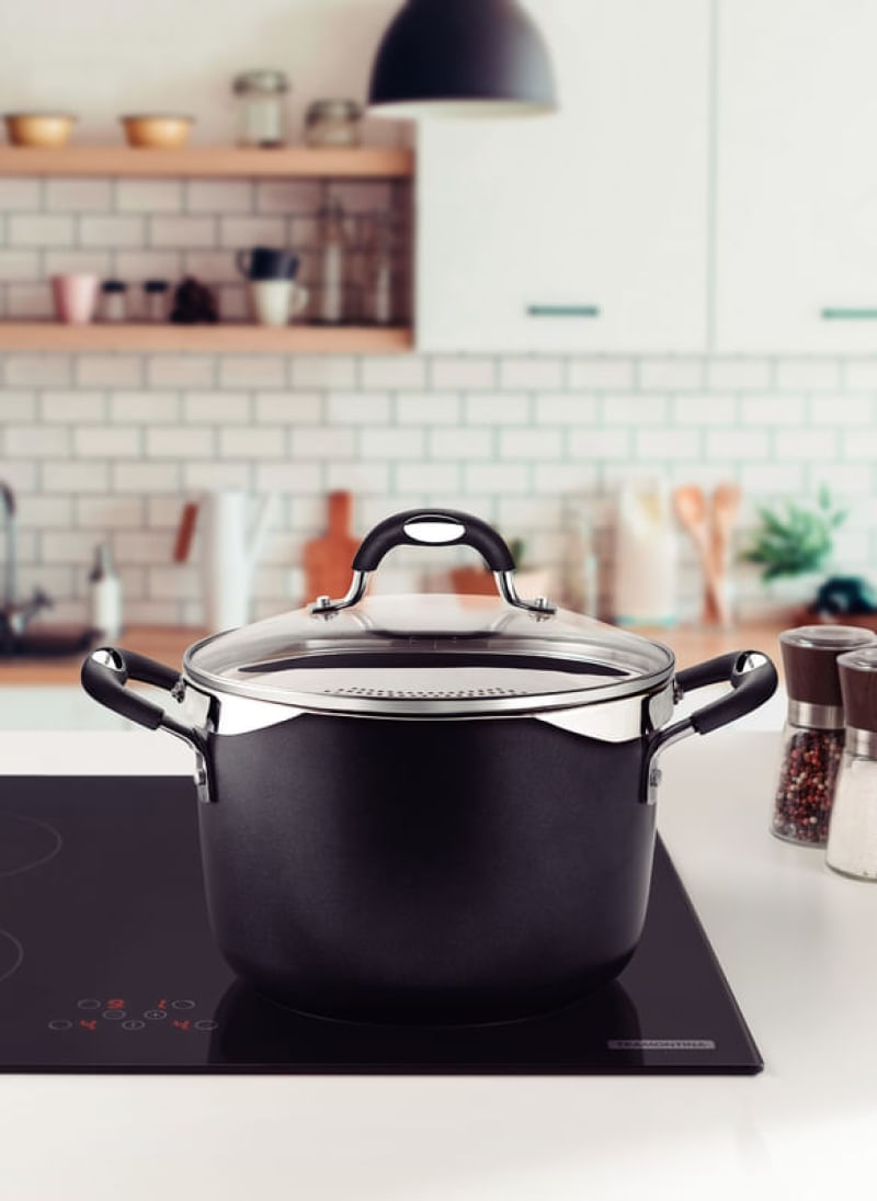 Com a Espagueteira Tramontina Mônaco Induction em Alumínio com Revestimento Interno e Externo Antiaderente Starflon Premium Preto com Tampa 22 cm de diâmetro 5,4 L você vai deixar o preparo daquele espaguete delicioso, ainda mais especial! Ela é produzida com corpo em alumínio com espessura especial e revestimento antiaderente Starflon Premium, características que juntas proporcionam um cozimento rápido e uniforme dos alimentos e evitam que eles grudem em sua superfície. Ela vem acompanhada de uma tampa de alumínio com trava antigiro: não gira durante o preparo. Seu cabo é metálico com proteção de silicone que reduz a propagação de calor e aumenta a segurança e o conforto durante o manuseio. Além disso, é fácil de limpar e pode ir à máquina de lavar louças!Descrição técnicaCorpo de alumínio com espessura de 3,0 mm que proporciona cozimento rápido e uniforme. Revestimento interno e externo de antiaderente Starflon Premium que não gruda, é fácil de limpar, mais durável e não é prejudicial a saúde.Tampa de vidro temperado com borda de aço inox. Alças e pegador metálicos com proteção de silicone que proporcionam redução da propagação de calor, aumentando a segurança e melhorando a empunhadura. Podem ir à máquina de lavar louças facilitando seu dia a dia.Orientação GeralA sua espagueteira pode ser utilizada como caldeirão, se utilizada sem o acessório escorredor. Para garantir que os orifícios de drenagem estejam completamente limpos, mergulhe o escorredor em água quente e sabão por alguns minutos e depois esfregue suavemente com uma esponja não abrasiva. A capacidade volumétrica máxima para cozimento é de 3/4 da capacidade total da peça.Utensílios quentes devem estar fora do alcance das crianças. Este produto não pode sofrer modificações. Antes do primeiro uso, lave com esponja macia, sabão neutro ou detergente líquido. Depois de secar, unte a área interna do caldeirão com óleo ou gordura e leve ao fogo por um ou dois minutos. Deixe esfriar e lave novamente. Seu utensílio Starflon está pronto para uso com ou sem gordura, sempre em fogo baixo ou médio (nunca superior a 220ºC). Em fogões de indução, usar somente em potência média e evitar a movimentação da peça para prevenir riscos na superfície do fogão. Para mexer os alimentos use somente utensílios de silicone, nylon ou madeira. Limpeza: Evite a imersão do utensílio quente em água fria. Nunca utilize produtos abrasivos na lavagem. Se deixar queimar alimentos, umedeça a área e reserve até que possa remover os resíduos grudados com esponja e sabão. Para maior durabilidade do produto, recomenda-se lavar manualmente. Para descarte dos produtos e embalagens siga as orientações de reciclagem vigentes. Este produto não necessita de manutenção, apenas limpeza. Garantia do produto: 90 dias de garantia de acordo com o Código de Defesa do Consumidor + a Garantia do Fabricante
