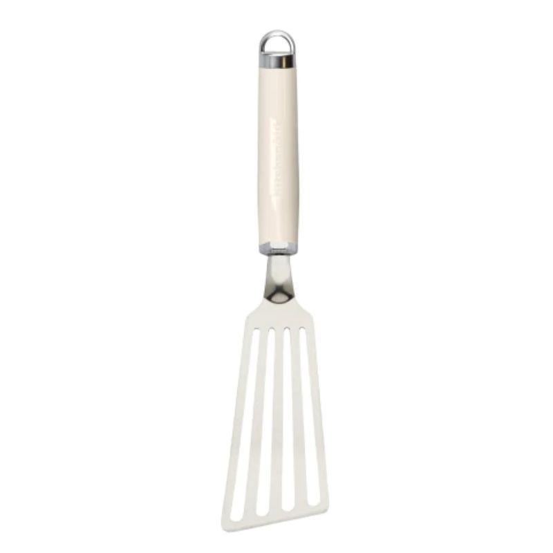 Espátula perfurada flexível da KitchenAid é ideal para alimentos delicados. Sua base reta e perfurada lhe permite cortar e servir tortas. Pode ser utilizado também para virar peixe e carne, fritos ou grelhados. É resistente, fácil de limpar e possui um orifício na extremidade do cabo que permite pendurá-lo e mantê-lo sempre ao alcance das suas mãos. A grande superfície da lâmina é fabricada em aço inoxidável de alta qualidade, o que garante durabilidade e resistência a altas temperaturas e a ferrugem. A superfície perfurada irá separar a gordura da frigideira. A alça brilhante apresenta um logotipo em relevo e uma alça para pendurar. Pode ser lavada na máquina de lavar louça. - Especificações: • Altura: 33cm • Largura: 7cm• Profundidade: 3cm • Material: Aço Inox • Cor: Creme