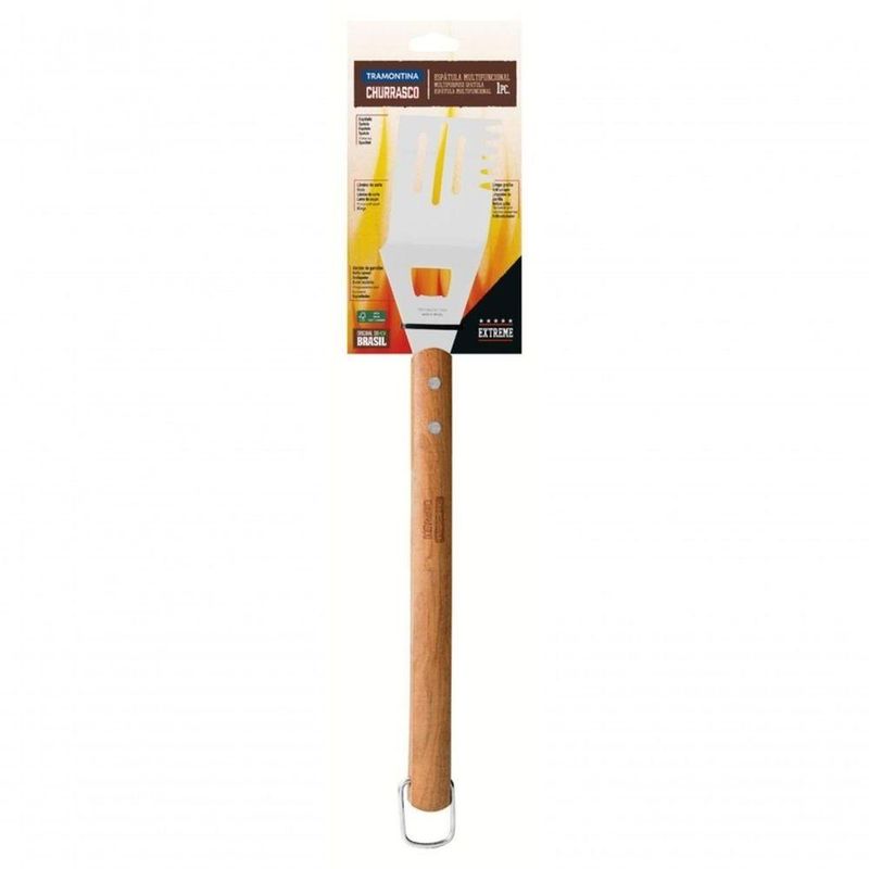 Espátula Multifuncional Tramontina Churrasco 50cm Lâmina Em Inox E Cabo De MadeiraCheirinho de churrasco é uma das melhores coisas que existem. E se vier acompanhado de praticidade fica ainda melhor. Por esse motivo para preparar e servir o seu, da melhor maneira, a Espátula Multifuncional Aço Inox Extreme é a escolha perfeita. Sirva a família e amigos com praticidade e estilo, e garanta elogios e sorrisos com este item essencial para o seu churrasco.Recomendações de Uso:Mode de uso: Antes da primeira utilização, remova as eventuais etiquetas e lave usando apenas uma esponja macia, sabão ou detergente neutro. Outros tipos de produtos, como palha de aço, poderão riscar ou prejudicar o acabamento da peça. Enxágue cada item a fim de remover totalmente os resíduos dos produtos de limpeza, que, por serem abrasivos, podem danificar o inox. Após a lavagem enxaguar e secar bem a peça, caso contrário, as substâncias químicas da água (cloro) poderão causar manchas. Para maior durabilidade do produto recomenda-se secar bem antes de guardar,- Tenha cuidado ao manusear produtos cortantes e perfurantes e mantenha-os fora do alcance de crianças.- Foto meramente ilustrativa.Informações Adicionais:- Lâmina de aço inox.- Cabo de madeira.- Rebites de alumínio.- Espátula com lâmina de corte, abridor de garrafas e limpa grelha. - Por tratar-se de cabo em madeira natural, este pode apresentar variações em sua tonalidade de acordo com o corte da madeira utilizado.