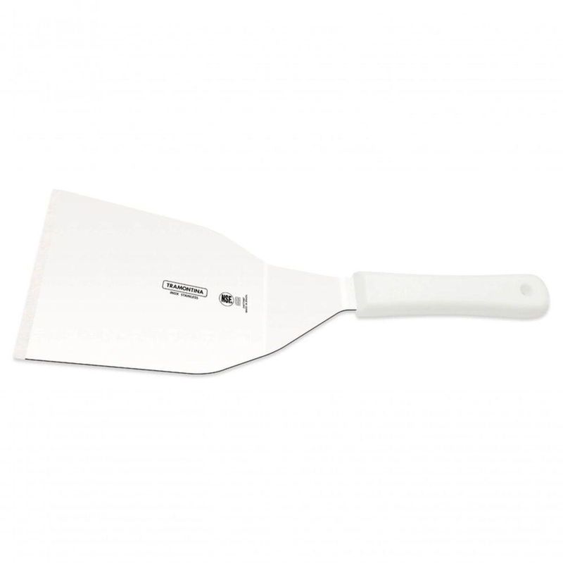 Espátula Para Hambúrguer Tramontina Com Lâmina Em Aço Inox E Cabo De Polipropileno Branco Qualidade e durabilidade para profissionais que trabalham muito. Com tecnologia de ponta, as facas profissionais estão sempre preparadas para entrar em ação e fazer bonito com qualquer ingrediente. Eficiência é o que não falta. A altíssima qualidade das lâminas, resultado do tratamento térmico composto por têmpera (aquecimento da lâmina), subzero (resfriamento de 50 a 196 graus negativos) e revenimento (aumento da elasticidade do aço) garante vida longa e eficiente. A anatomia e ergonomia do cabo de polipropileno texturizado, injetado diretamente sobre a espiga da lâmina, oferecem e conforto durante o manuseio. A proteção antimicrobiana inibe e reduz o crescimento de bactérias e fungos. Essa tecnologia é incorporada durante o processo de fabrição do cabo e dura por toda vida útil do produto, mas não não elimina a necessidade de lavá-los.Recomendações de Uso:Antes do uso: Antes de utilizar o , remova as eventuais etiquetas e lave-o com água quente e de uso: Durante a lavagem use somente esponja macia, outros tipos de produtos, como palha de aço, poderão riscar ou prejudicar o brilho do aço inox. Enxágue bem a peça a fim de remover totalmente os resíduos dos produtos de limpeza, que por serem abrasivos, podem danificar o inox. Após a lavagem enxugue a faca, pois as substâncias químicas contidas na água poderão causar manchas. Sempre que possível use água quente, pois renova o brilho do talher. Evite o das peças com superfícies quentes, pois podem provocar a descoloração do produto. Quando usar a máquina de lavar louça, recomendamos retirar o talher logo que tenha terminado o ciclo enxaguar, a fim de que os mesmos sejam secados cuidado ao manusear produtos cortantes e perfurantes e mantenha-os fora do alcance de crianças.Informações Adicionais:- Lâmina fabricada em aço inox de altíssima qualidade, que aliado ao eficiente tratamento térmico sub-, confere à espátula grande resistência ao desgaste do fio.- Cabo de polipropileno com proteção antibacteriana, que inibe e reduz o crescimento de bactérias gram-positivas e fungos. Isso significa um produto mais limpo por mais tempo, trazendo benefícios em higiene e redução na população de microorganismos que causam contaminação. A tecnologia antibacteriana é incorporada durante o processo de fabricação dos produtos, na injeção dos cabos, e dura por toda a vida útil dos mesmos.- Cabo com furo passante para pendurar o produto.- Certificado Internacional de Qualidade e Excelência: desde que a Tramontina obteve a certificação NSF (National Sanitation Fundation), vem utilizando junto à sua marca essa simbologia, que representa o reconhecimento de uma organização internacional e independente à linha de Facas Profissionais Tramontina.- Para evitar a formação de folgas ou frestas entre as partes e a retenção de resíduos, além de facilitar a limpeza, o cabo é injetado diretamente sobre a espiga da própria lâmina.- Foto meramente ilustrativa.