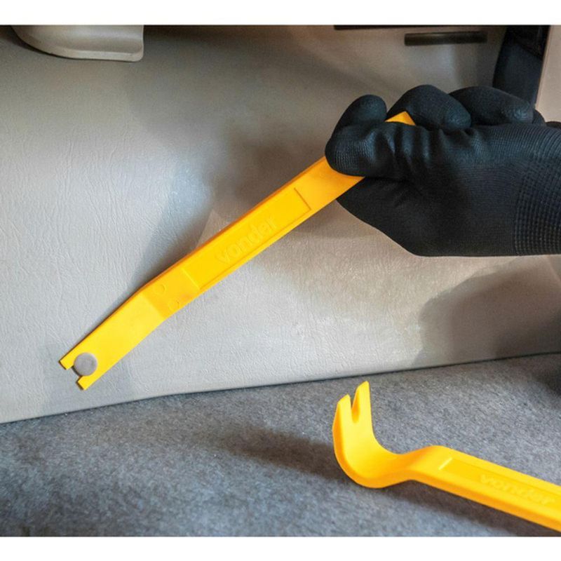 Espatulas De Nylon Jogo Com 11pcs Vonder Conteúdo Embalagem: 1 Jogo composto por 1 estojo em lona com 11 peças, sendo: 1 removedor largo (160 mm x 64 mm), 1 removedor de grampo com puxador (180 mm x 30 mm), 1 removedor acessível (195 mm x 30 mm), 1 removedor de grampo para estofado (213 mm x 20 mm), 1 removedor de ângulo (175 mm x 20 mm), 1 removedor angular de clipe para painel (195 mm x 30 mm), 1 removedor de clipe painel com serra (205 mm x 38 mm), 1 removedor de painéis com ponta fina (205 mm x 23 mm), 1 removedor de painéis ponta dupla (205 mm x 25 mm), 1 removedor de painéis reto (205 mm x 17 mm) e 1 removedor plano para painel (205 mm x 30 mm) Destaques e diferenciais: Fabricado em nylon, possibilita a desmontagem de vários tipos de acabamentos internos e externos de veículos sem danificá-los, além de proporcionar uma excelente resistência Aplicações e dicas de uso: Utilizado na desmontagem de diversos acabamentos de veículos, como: painéis, forros de portas, entre outros. Também pode ser utilizado na desmontagem de computadores e eletrônicos em geral. Características Técnicas: Material: Nylon Dimensões das espátulas (comp. x larg.): Ver campo conteúdo da embalagem Produto: Espatulas