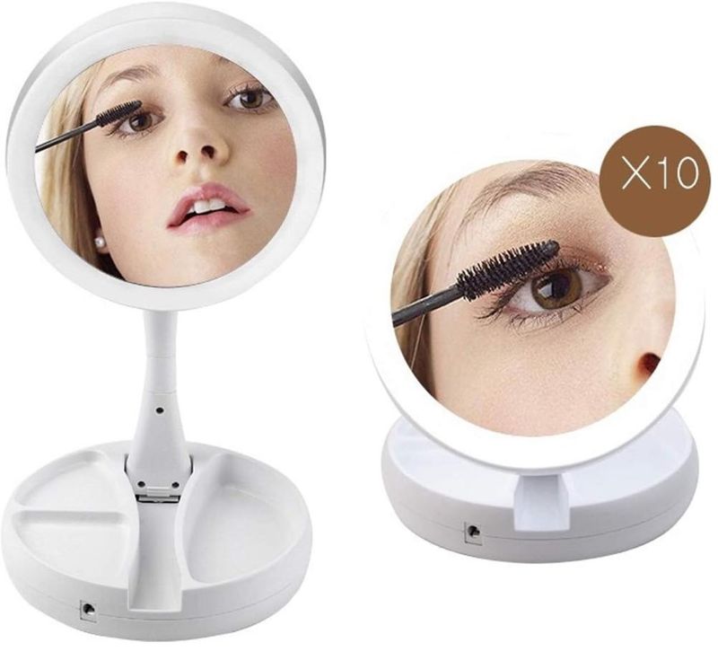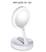 Espelho De Maquiagem Com Luz Led Aumenta 10X Dobravel e Portátil O espelho é feito para você que mesmo na correria cotidiana, sempre arruma um tempinho para retocar a maquiagem ou arrumar o cabelo, é portátil, contem Leds melhor visualização.Por ser dobrável, leve e compacto, ocupa pouco espaço, sendo ideal para guardar na bolsa, na mala de viagem e até mesmo em casa e estende-se para um máximo de 13" de altura!Este espelho de maquiagem é iluminado com Leds, sendo muito prático, basta pressionar um botão na parte inferior do suporte, que ligará as luzes LED que são super brilhantes em ambos os lados para iluminação perfeita da imagem.Também possui os dois lados funcionais (frente e verso), sendo de um lado com ampliação de 1x para maquiagem geral e do outro lado apresenta grande ampliação 10x para realização de trabalhos detalhados.Informações Técnicas:- Modelo: Espelho Led 10x Dupla Face- Material do Suporte: Plástico- Vidro: Livre de distorção- LED’s: São classificados por 30.000 horas- Espelho de Aumento: 10x- Construído em organizador para acessórios- Requerimentos: 4 pilhas AA- Peso: 400gMedidas do Produto:- Espelho Aberto: 34 x 16 x 18cm (AxLxC)- Apenas o Espelho: 13x13cm (Largura x Comprimento)- Espelho Fechado/Dobrado: 5 x 16 x 18cm (AxLxC)Itens inclusos:1 - Espelho Dobrável com LED e 360º1 - Manual de Instruções1 - Cabo Usb