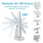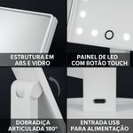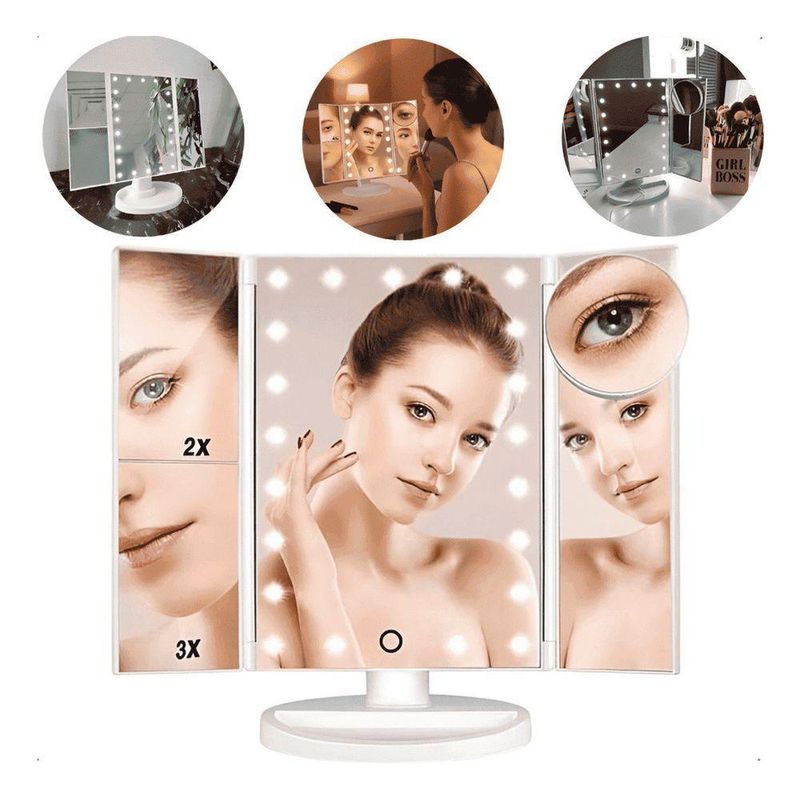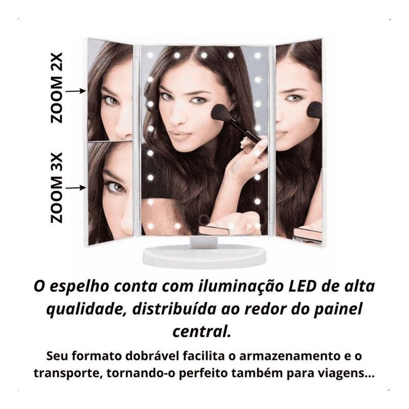 Espelho De Maquiagem Dobrável Triplo Com Iluminação Led - BrancoUm acessório moderno, prático e ideal para quem busca precisão na maquiagem, cuidados com a pele ou depilação. Com seu design elegante e funcional, ele oferece uma experiência semelhante à de um camarim profissional no conforto da sua casa. Possui três painéis articulados, sendo o espelho central com visão normal e os espelhos laterais com ampliações de 2x e 3x, proporcionando uma visão detalhada do rosto para aplicação minuciosa de produtos. Seu formato dobrável facilita o armazenamento e o transporte, tornando-o perfeito também para viagens.O espelho conta com iluminação LED de alta qualidade, distribuída ao redor do painel central. A intensidade da luz pode ser ajustada por meio de um botão sensível ao toque, garantindo a iluminação ideal para diferentes ambientes e momentos do dia. Sua estrutura permite rotação de até 180°, oferecendo flexibilidade para posicioná-lo no ângulo mais confortável durante o uso. Além disso, o espelho pode ser conectado via cabo USB (incluso), oferecendo versatilidade e praticidade. Fabricado em plástico ABS resistente com espelhos de qualidade, o modelo une durabilidade e leveza. Acompanha cabo usb para espelho LEDEspecificações:Composição: Plástico(ABS), Vidro e componentes EletrônicosDimensões aprox.: Alt: 31,5cm x Larg: 13,5cm x Comp: 18,5cmDimensão aprox. do espelho Aberto: Alt: 26cm x Comp.: 40cmPeso Aprox.: 912gCor: BrancaContém;01 Espelho de Maquiagem Dobrável Triplo com Iluminação LED - Branca