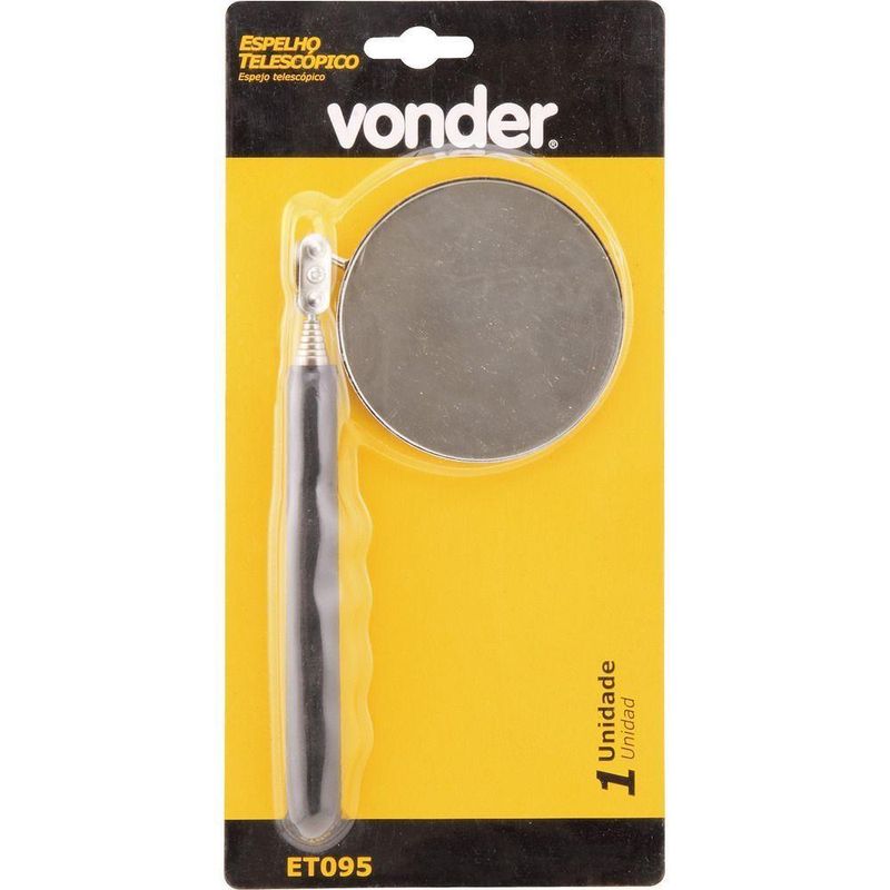 Espelho Telescópico 83,5mm Comprimento 275-955mm Et095 - VonEspelho Telescópico 83,5mm Comprimento 275-955mm Et095 - VonderDescubra o Espelho Telescópico da Vonder, uma ferramenta essencial para quem precisa de uma visão ampliada em áreas de difícil acesso. Com um design compacto e retrátil, este espelho é ideal para profissionais que trabalham em oficinas mecânicas, laboratórios ou qualquer ambiente que exija inspeção minuciosa. Fabricado com material resistente e durável, ele garante longevidade e eficiência no uso diário. O cabo plastificado e o espelho articulável proporcionam conforto e flexibilidade, permitindo ajustes precisos para uma inspeção detalhada. A Vonder é uma marca reconhecida pela qualidade e inovação em ferramentas, garantindo que você tenha sempre o melhor em suas mãos. Este espelho telescópico é uma prova disso, oferecendo praticidade e segurança em suas atividades.ESPECIFICAÇÕES TÉCNICAS:- Marca: Vonder- Código universal de produto: 7893946163204- Modelo: 7893946163204- Diâmetro do espelho: 83,5 mm- Comprimento aberto: 955,0 mm- Comprimento fechado: 275,0 mmFUNÇÕES E CARACTERÍSTICAS:- Visão ampliada para áreas de difícil acesso- Design compacto e retrátil- Material resistente e durável- Cabo plastificado para maior conforto- Espelho articulável para ajustes precisosINSTRUÇÕES DE USO:1. Ajuste o comprimento do espelho conforme necessário.2. Utilize o espelho articulável para alcançar o ângulo desejado.3. Após o uso, limpe o espelho com um pano macio para manter a visibilidade.4. Armazene em local seco para prolongar a vida útil do produto.ITENS INCLUSOS:- 1 Espelho telescópico Produto: Espelho