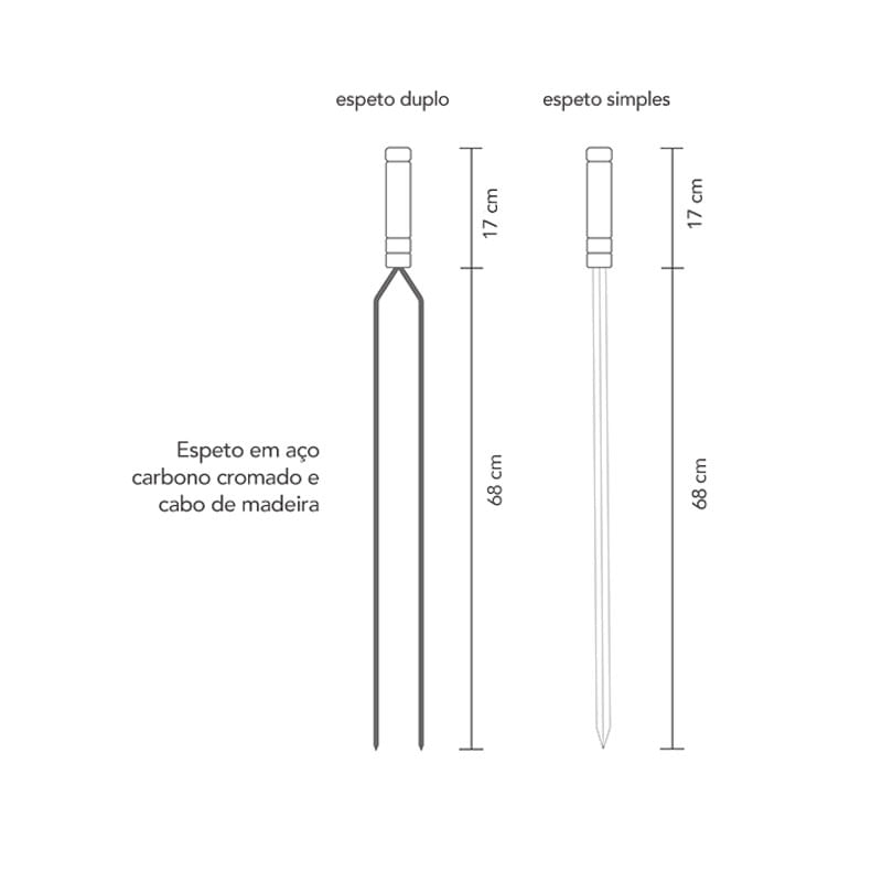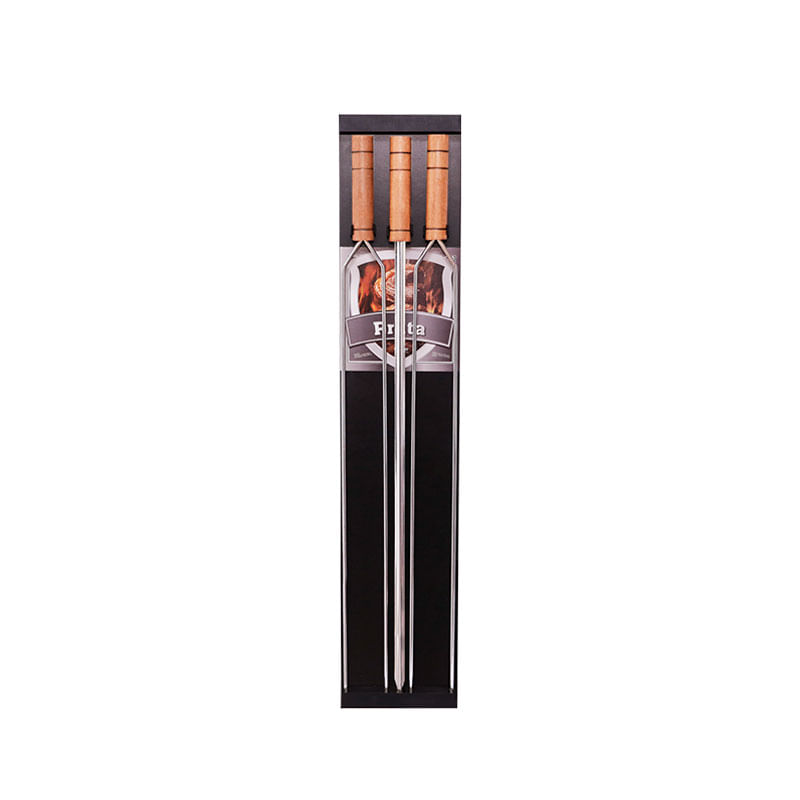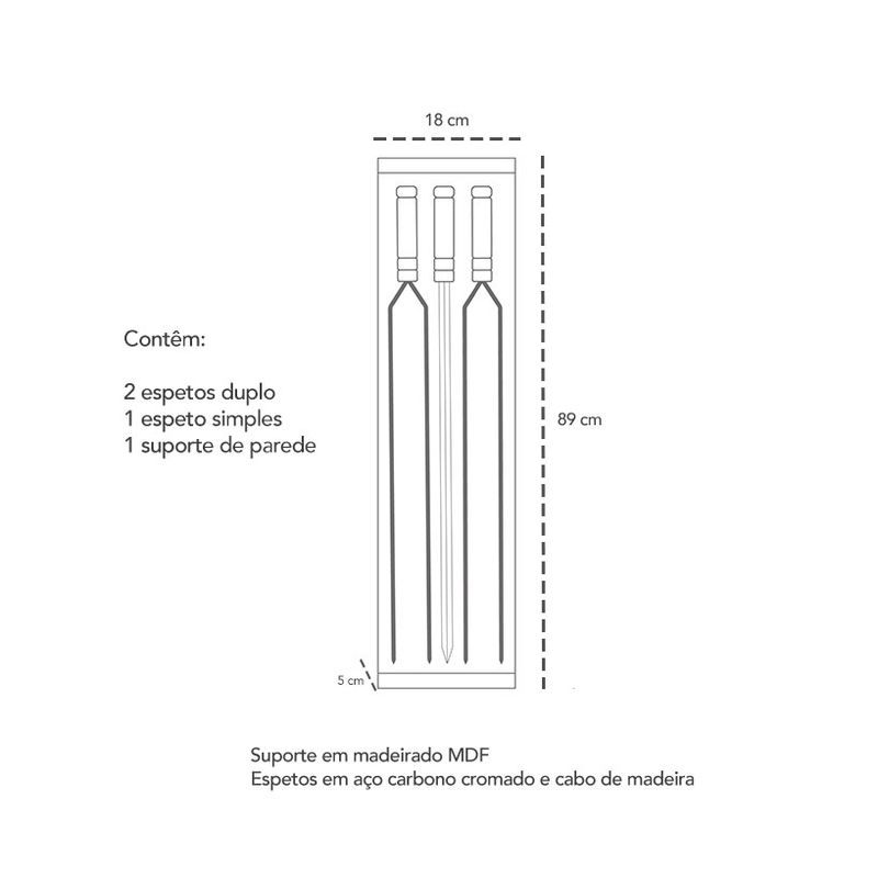 Suporte de parede com espetos. O Suporte para espetos é fabricado em madeirado MDF preto e espeto em aço carbono cromado com cabo de madeira. Produto de alta durabilidade e resistência que combina com ambientes rústicos e modernos. De fácil instalação, acompanha bucha e parafuso. O Kit para churrasco possibilita assar frango, carne suína, bovina, linguiça, coração e legumes. Contêm: 2 Espetos Duplo 1 Espeto Simples 1 Suporte de Parede Dimensão: 89 x 18 cm Material: Madeira, MDF e aço carbono Casacha é uma loja especializada em artigos para churrasco, bar, casa e cozinha.