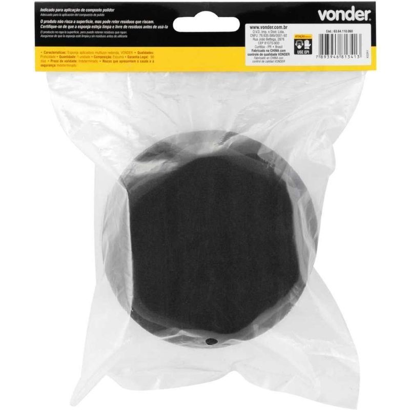 Esponja Aplicadora Multiuso Redonda VonderCódigo do Fornecedor: 6364110060Marca: VonderConteúdo da embalagem: 1 Esponja aplicadora.Destaques e diferenciais: Possui formato e design que proporcionam maior eficiência nas aplicações.Aplicações e dicas de uso: Indicada para aplicação de composto polidor. O produto não risca a superfície, mas pode reter resíduos que riscam. Certifique-se de que a esponja esteja limpa e livre de resíduos antes de usá-la. legal: 3 mesesQualificação TécnicaMaterial (tipo/composição): EspumaDimensões: Ø110 mm x 60 mmMassa aproximada (peso) (kg): 0,025 kgNA