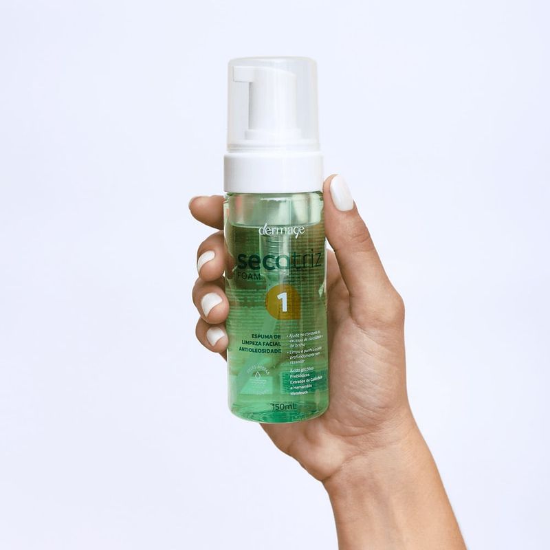 Espuma de Limpeza Facial Dermage Secatriz Foam 150ml A Espuma de Limpeza Facial Dermage Secatriz Foam é o primeiro passo essencial na rotina de cuidados com a pele oleosa. Com tecnologia purificante e fórmula dermatologicamente testada, promove uma limpeza profunda que remove impurezas, resíduos de maquiagem e excesso de sebo, sem causar ressecamento. O resultado é uma pele fresca, equilibrada e visivelmente mais saudável desde o primeiro uso. Indicada para peles oleosas e mistas, essa espuma facial atua com ação antibacteriana e calmante, equilibrando a microbiota cutânea e deixando uma sensação imediata de conforto e suavidade. Benefícios Remove impurezas e controla a oleosidade sem agredir a pele; Purifica e desobstrui os poros, ajudando a prevenir cravos e espinhas; Sensação de limpeza profunda e frescor imediato; Equilibra a barreira protetora da pele, mantendo a hidratação natural; Ação calmante e adstringente, ideal para uso diário; Vegano, cruelty free e livre de parabenos, álcool e óleo mineral. Ativos de Alta Performance Ácido Glicólico: promove esfoliação suave e renovação celular, ajudando a melhorar a textura da pele e a reduzir o excesso de oleosidade. Prebióticos: fortalecem a barreira cutânea e equilibram a microbiota natural da pele, prevenindo irritações e inflamações. Extratos de Calêndula e Hamamélis: atuam com ação calmante, adstringente e anti-inflamatória, suavizando a pele após a limpeza. Óleo de Melaleuca (Tea Tree Oil): potente antibacteriano natural, que contribui para uma pele mais limpa, purificada e livre de acne. Modo de Uso Umedeça o rosto e aplique de 1 a 2 pumps da espuma na palma das mãos. Massageie suavemente o rosto com movimentos circulares. Enxágue com água abundante e seque delicadamente. Use diariamente, pela manhã e à noite, para potencializar o controle da oleosidade. Dica: combine o uso da espuma com outros produtos da linha Secatriz Dermage, como o Gel Secativo Acne Spot e o Spray Secatriz Acne Free, para um tratamento completo contra a acne. Precauções Uso externo. Evite contato com os olhos. Em caso de irritação, suspenda o uso e procure orientação médica. Mantenha fora do alcance de crianças e conserve em local fresco.