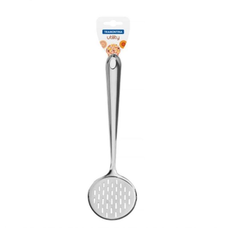Espumadeira Tramontina Utility Em Aço InoxUma mesa bem-posta é uma presente que todo mundo pode se dar todosos dias. Talheres e acessórios brilhantes, uma toalha bonita e pequenostoques de decoração tornam qualquer momento mais especial. Afinal, umaboa refeição deve ser saboreada também com os olhos.Recomendações de Uso:Antes do uso: Antes de utilizar o , remova as eventuais etiquetas e lave-o com água quente e de uso:Durante a lavagem use somente esponja macia, outros tipos de produtos, como palha de aço, poderão riscar ou prejudicar o brilho do produto. Enxágue bem a peça a fim de remover totalmente os resíduos dos produtos de limpeza, que por serem abrasivos, podem danificar o inox. Após a lavagem enxugue-o, pois as substâncias químicas contidas na água poderão causar manchas. Sempre que possível use água quente, pois renova o brilho do produto. Evite o da peça com superfícies quentes, pois podem provocar a descoloração do produto. Quando usar a máquina de lavar louça, recomendamos retirar o produto logo que tenha terminado o ciclo enxaguar, a fim de que o mesmo seja secado manualmente.- Foto meramente ilustrativa.Informações Adicionais:- Em aço inoxidável, altamente durável, mantém as características , preservando a beleza, a higiene e a durabilidade do material.- Pode ser lavado, diariamente, na máquina de lavar louças.