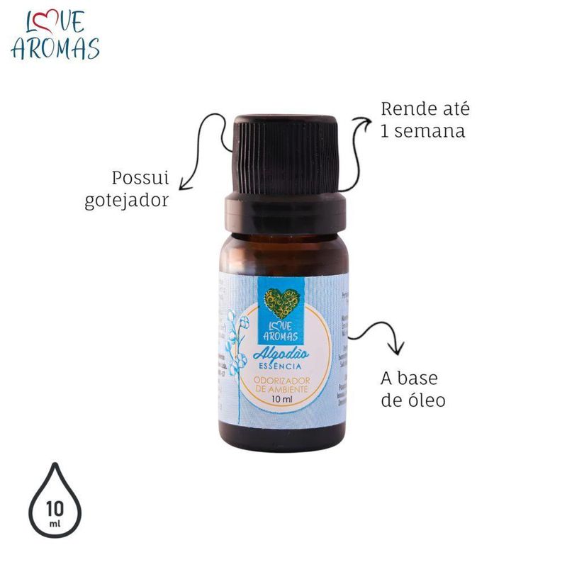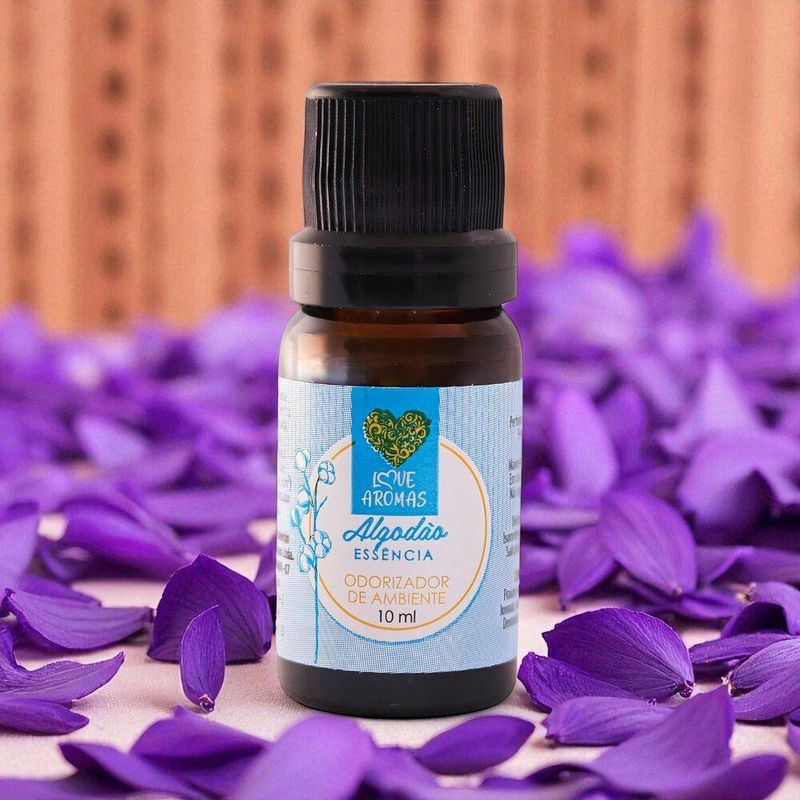 Essência Aromática Algodão 10ml Love Aromas Para Difusor ElétricoAs essências lipossolúveis Love Aromas foram desenvolvidas especialmente para aromatizar com alta performance em difusores elétricos ou na produção de velas e sabonetes artesanais.O que são essências lipossolúveis?São essências à base de óleo, que não precisam de água para uso em difusores elétricos. Isso garante maior concentração, fixação e rendimento no ambiente.Especificações do produto:Características do produto:• Alta concentração e rendimento• Ideal para difusores elétricos• Frasco âmbar de vidro• Tampa com lacre de segurança• Gotejador que facilita o uso e evita desperdícios• Rende até 1 semana com uso contínuo (em média)Especificações técnicas:• 10 ML• Vidro âmbar• Tampa lacre• Gotejador para facilitar a aplicação