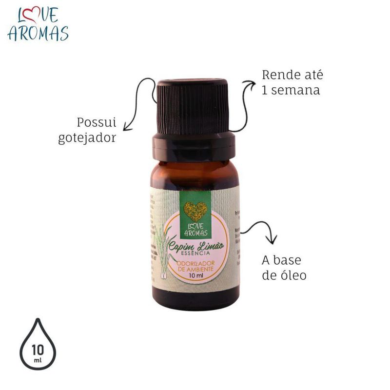 Essência Aromática Capim Limão 10ml Love Aromas Para Difusor ElétricoAs essências lipossolúveis Love Aromas foram desenvolvidas especialmente para aromatizar com alta performance em difusores elétricos ou na produção de velas e sabonetes artesanais.O que são essências lipossolúveis?São essências à base de óleo, que não precisam de água para uso em difusores elétricos. Isso garante maior concentração, fixação e rendimento no ambiente.Especificações do produto:Características do produto:• Alta concentração e rendimento• Ideal para difusores elétricos• Frasco âmbar de vidro• Tampa com lacre de segurança• Gotejador que facilita o uso e evita desperdícios• Rende até 1 semana com uso contínuo (em média)Especificações técnicas:• 10 ML• Vidro âmbar• Tampa lacre• Gotejador para facilitar a aplicação