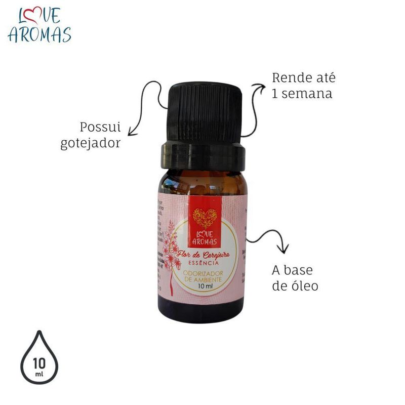 Essência Aromática Flor De Cerejeira 10ml Love Aromas Para Difusor ElétricoAs essências lipossolúveis Love Aromas foram desenvolvidas especialmente para aromatizar com alta performance em difusores elétricos ou na produção de velas e sabonetes artesanais.O que são essências lipossolúveis?São essências à base de óleo, que não precisam de água para uso em difusores elétricos. Isso garante maior concentração, fixação e rendimento no ambiente.Especificações do produto:Características do produto:• Alta concentração e rendimento• Ideal para difusores elétricos• Frasco âmbar de vidro• Tampa com lacre de segurança• Gotejador que facilita o uso e evita desperdícios• Rende até 1 semana com uso contínuo (em média)Especificações técnicas:• 10 ML• Vidro âmbar• Tampa lacre• Gotejador para facilitar a aplicação