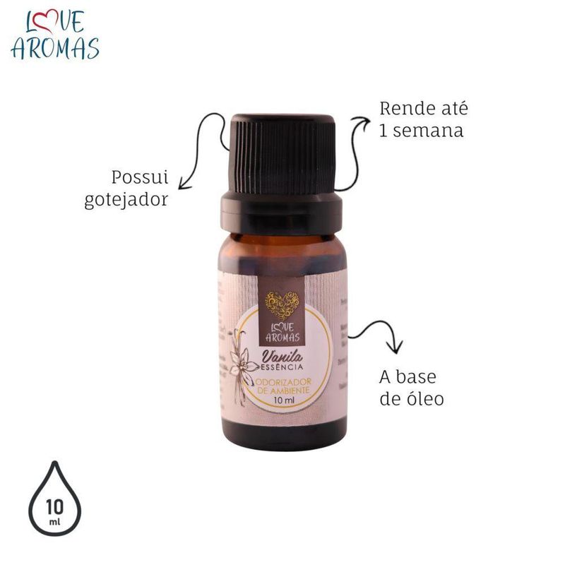 Essência Aromática Vanila 10ml Love Aromas Para Difusor ElétricoAs essências lipossolúveis Love Aromas foram desenvolvidas especialmente para aromatizar com alta performance em difusores elétricos ou na produção de velas e sabonetes artesanais.O que são essências lipossolúveis?São essências à base de óleo, que não precisam de água para uso em difusores elétricos. Isso garante maior concentração, fixação e rendimento no ambiente.Especificações do produto:Características do produto:• Alta concentração e rendimento• Ideal para difusores elétricos• Frasco âmbar de vidro• Tampa com lacre de segurança• Gotejador que facilita o uso e evita desperdícios• Rende até 1 semana com uso contínuo (em média)Especificações técnicas:• 10 ML• Vidro âmbar• Tampa lacre• Gotejador para facilitar a aplicação