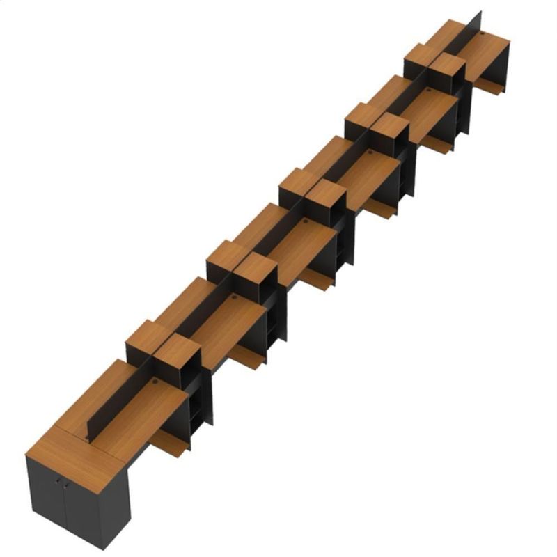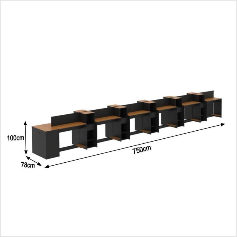 Estação De Trabalho 12 Lugares Office Tech 12 Mesas 10 Armár - Preto E Cedro Preto E CedroO Conjunto de Escritório Tech Office é compacto e funcional, ideal para ambientes profissionais e home office. Contando com sua Escrivaninha com passa fios e suporte para CPU, Buffet Aparador com 2 Portas e dobradiças metálicas e o Armário Livreiro compacto e funcional, com 3 nichos e 1 gaveta. Todos com tampo em MDF usinado e sapatas de PVC, unindo design moderno e praticidade. Confira a linha Tech completa em nossos anúncios e transforme seu espaço com inteligência e estilo!Especificações Técnicas do Conjunto de Escritório Tech Office:- Material: MDP/MDF;- Tampo: MDF usinado;- Acabamento: Pintura UV;- Produto Precisa de Montagem? Sim;- de Portas: 2;- de Gavetas: 10;- de Prateleiras: 10;- Puxadores: PVC;- Dobradiças: Metálicas;- Pés: Sapatas Fixas de PVC;- Instruções de Cuidado: Limpar com pano levemente umedecido;- Medidas do Livreiro (Altura x Largura x Profundidade): 99,5 x 33,4 x 28,5 cm;- Medidas da Escrivaninha (Altura x Largura x Profundidade): 73,5 x 91 x 38,4 cm;- Medidas do Aparador (Altura x Largura x Profundidade): 73,5 x 76,6 x 38,4 cm;- Conteúdo da Embalagem: 12 Escrivaninha, 10 Livreiro, 01 Aparador e 03 Kit Divisórias - Entregue em: 26 Volumes.Observações Importantes:Produto não deve ficar exposto diretamente ao sol, calor e umidades excessivas.Recomendações de Limpeza: Utilize somente pano seco ou levemente umedecido.Imagens meramente ilustrativas, produto não acompanha objetos de decoração e eletrônicos.Ao receber, verifique a embalagem. Se detectar ou violação na mesma, recuse o e nos contate.Não nos responsabilizamos pela montagem e por problemas causados pela montagem realizada por você ou montador contratado.Enfatizamos a recomendação aos nossos clientes de contratar um montador .Eventualmente, se faltar qualquer peça ou acessório no produto, nos contate e enviaremos a peça/acessório sem custo adicional. Altura da Mesa (cm): 74cm | Altura do Armário (cm): 99cm | Altura do Aparador (cm): 74cm | Largura da Mesa (cm): 91cm | Largura do Armário (cm): 33cm | Largura do Aparador (cm): 77cm | Profundidade da Mesa (cm): 38cm | Profundidade do Armário (cm): 28cm | Profundidade do Aparador (cm): 38cm | Altura dos Pés (cm): Não se aplica | Ambiente Principal: Escritório | Complexidade da Montagem: Média: pode ser montado por mais de uma pessoa e/ou necessite de maior conhecimento para montagem | Cor do Produto: Off White/Cedro | Cor Predominante: Off White | Cor Interna: Off White | Acabamento: Pintura UV | Acabamento da Gaveta: Pintura UV | Acabamento dos Pés: PVC | Escala de Brilho: Fosco | Escala de Brilho da Gaveta: Fosco | Garantia: 3 meses | Bandeja: Não | Estilo: Moderno | Itens Inclusos: 12 Mesa, 10 Armário, 1 Aparador, Manual de Montagem e Kits de Montagem | Linha ou Coleção: Tech | Possui Portas: Sim | Inclui manual de montagem: Sim | Marca: ViaNossa | Possui Rodízio: Não | Material da Gaveta: MDP/MDF | Material dos Pés: PVC | Cor: Preto e Cedro