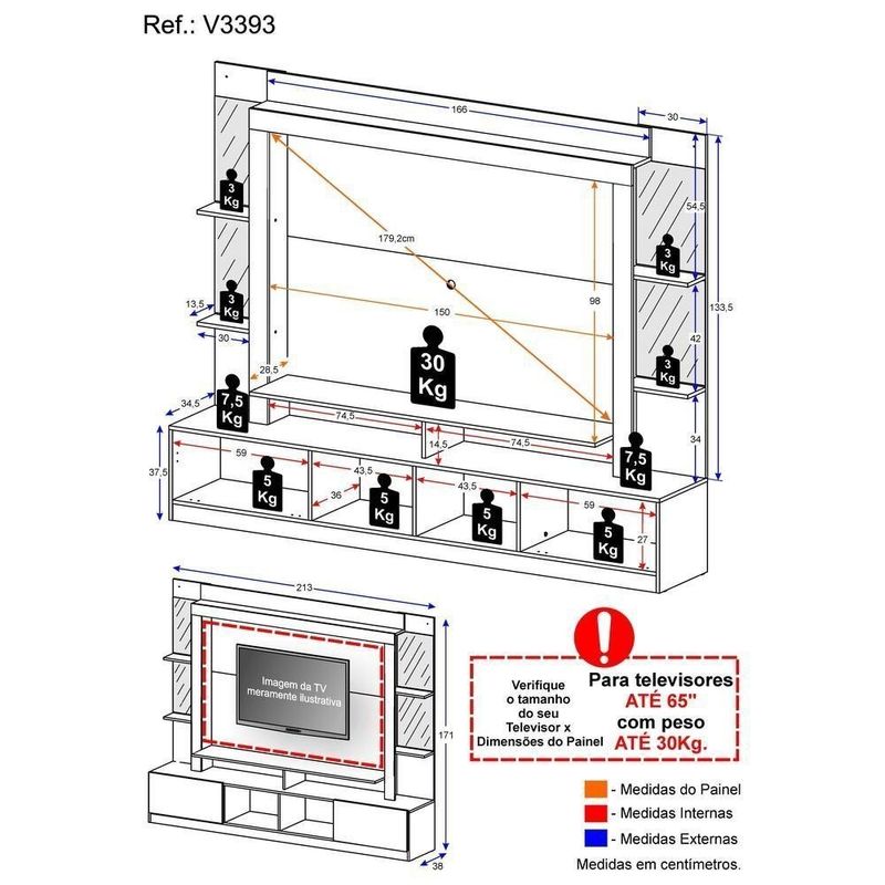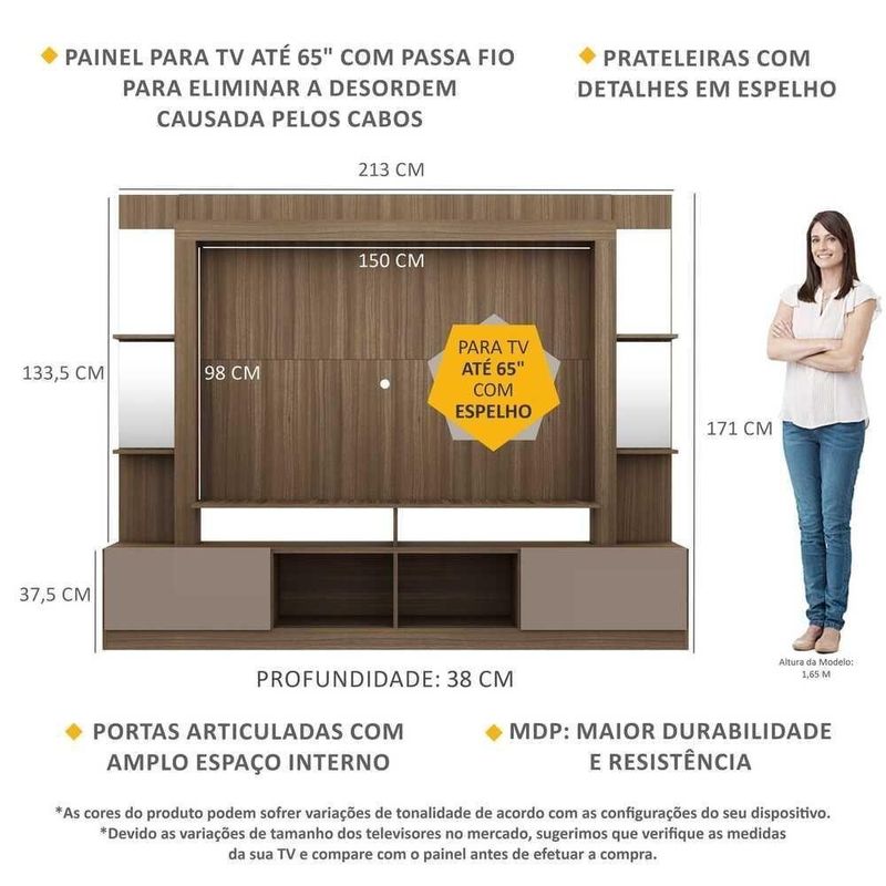 A Estante 65" Prateleiras c/ Espelho Oslo Multimóveis é perfeita para você deixar seu ambiente organizado e muito bem decorado. Produzida em MDP, que garante maior durabilidade e facilidade na limpeza, além de um acabamento superior, possui 2 portas articuladas com um excelente espaço interno para organizar seus pertences, prateleiras com detalhes em espelho para que você possa personalizar a decoração e nichos para acomodar todos os equipamentos. O painel para de até 65” (suporta até 30kg) e possui espaçamento para passagem dos fios, que permite deixar os cabos mais organizados. Os espelhos são de vidro (o que evita que a imagem fique distorcida) e lapidados, ou seja, passam por um processo para que as bordas não fiquem cortantes, o que garante maior segurança. Uma sala de estar moderna, aconchegante e linda para receber os amigos e curtir os melhores filmes e séries. Conteúdo da Embalagem:1 (uma) estante1 (um) kit com 4 (quatro) espelhosDimensões do produto montado:Altura: 171cm | Largura: 213cm | Profundidade: 38cmPainel - Altura: 98cm | Largura: 150cm*Devido as variações de tamanho dos televisores no mercado, sugerimos que verifique as medidas da sua e compare com o painel antes de efetuar a compra.*Você pode consultar as medidas internas na imagem técnica do produto.*As cores do produto podem sofrer variações de tonalidade de acordo com as configurações do seu dispositivo.Imagem meramente ilustrativa. Decoração e eletros não acompanham o produto. O produto será entregue desmontado e não disponibilizamos o serviço de montagem.