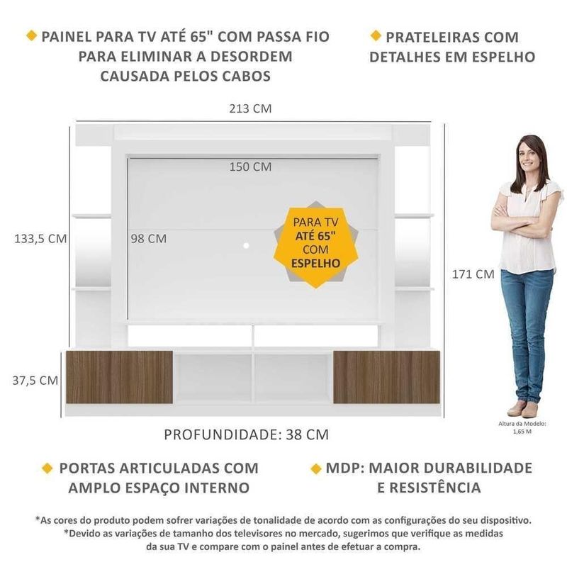 A Estante 65" Prateleiras c/ Espelho Oslo Multimóveis é perfeita para você deixar seu ambiente organizado e muito bem decorado. Produzida em MDP, que garante maior durabilidade e facilidade na limpeza, além de um acabamento superior, possui 2 portas articuladas com um excelente espaço interno para organizar seus pertences, prateleiras com detalhes em espelho para que você possa personalizar a decoração e nichos para acomodar todos os equipamentos. O painel para de até 65” (suporta até 30kg) e possui espaçamento para passagem dos fios, que permite deixar os cabos mais organizados. Os espelhos são de vidro (o que evita que a imagem fique distorcida) e lapidados, ou seja, passam por um processo para que as bordas não fiquem cortantes, o que garante maior segurança. Uma sala de estar moderna, aconchegante e linda para receber os amigos e curtir os melhores filmes e séries. Conteúdo da Embalagem:1 (uma) estante1 (um) kit com 4 (quatro) espelhosDimensões do produto montado:Altura: 171cm | Largura: 213cm | Profundidade: 38cmPainel - Altura: 98cm | Largura: 150cm*Devido as variações de tamanho dos televisores no mercado, sugerimos que verifique as medidas da sua e compare com o painel antes de efetuar a compra.*Você pode consultar as medidas internas na imagem técnica do produto.*As cores do produto podem sofrer variações de tonalidade de acordo com as configurações do seu dispositivo.Imagem meramente ilustrativa. Decoração e eletros não acompanham o produto. O produto será entregue desmontado e não disponibilizamos o serviço de montagem.
