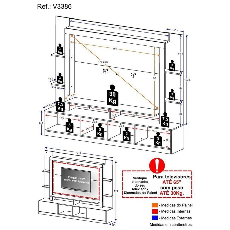 A Estante com Suporte 65" e 2 portas Oslo Multimóveis é perfeita para você deixar seu ambiente organizado e muito bem decorado. Produzida em MDP, que garante maior durabilidade e facilidade na limpeza, além de um acabamento superior, possui 2 portas articuladas com um excelente espaço interno para organizar seus pertences. Com prateleiras para que você possa personalizar a decoração, deixando-a do seu estilo e nichos para acomodar todos os equipamentos, o painel com suporte para de até 65” (suporta até 30kg) possui espaçamento para passagem dos fios, que permite deixar os cabos mais organizados. Para facilitar a sua vida, este produto acompanha também o kit para fixação da . Muito prático e de fácil instalação, pode ser utilizado para ’s LCD, LED e plasma de 14” a 71”. Totalmente sobreposto, acompanha gabarito de montagem que auxilia na instalação. Conta com um sistema de encaixe rápido, possui 16mm de deslocamento que permite o ajuste do encaixe das peças.Conteúdo da Embalagem:1 (uma) estante1 (um) kit com suporte Dimensões do produto montado:Altura: 171cm | Largura: 213cm | Profundidade: 38cmPainel - Altura: 98cm | Largura: 150cm*Devido as variações de tamanho dos televisores no mercado, sugerimos que verifique as medidas da sua e compare com o painel antes de efetuar a compra.*Você pode consultar as medidas internas na imagem técnica do produto.*As cores do produto podem sofrer variações de tonalidade de acordo com as configurações do seu dispositivo.Imagem meramente ilustrativa. Decoração e eletros não acompanham o produto. O produto será entregue desmontado e não disponibilizamos o serviço de montagem.