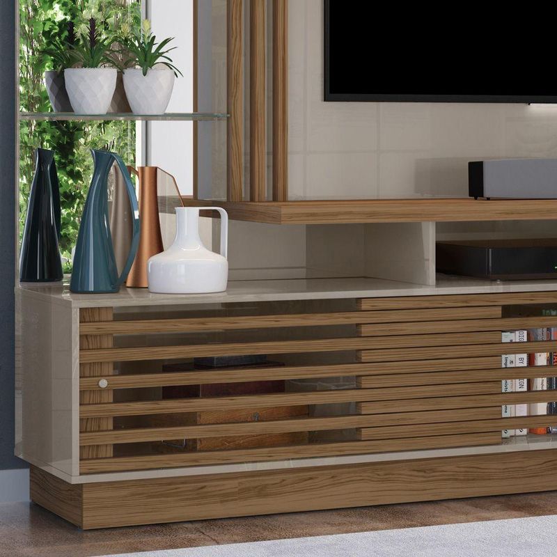 Estante De Tv 60 Pol 200cm Sala De Estar Lumari Fendi/naturale M20 - D'rossiA Estante de TV 60 Pol Lumari no tom Fendi e Naturale é a escolha ideal para quem deseja aliar design contemporâneo, organização e sofisticação na Sala de Estar. Com 200 cm de largura, este móvel foi desenvolvido para acomodar TVs de até 60 polegadas, oferecendo elegância e funcionalidade em cada detalhe. O destaque fica por conta das portas ripadas deslizantes, que agregam charme ao visual e otimizam o espaço. As prateleiras de vidro e espelhos integrados conferem profundidade e modernidade, enquanto a iluminação em LED embutida cria uma atmosfera aconchegante e sofisticada. Produzida com chapas em MDP de alta resistência e tampo de 40mm, a estrutura garante durabilidade e suporte firme para sua TV e itens decorativos. Um verdadeiro painel multifuncional que transforma o ambiente com estilo e praticidade. Dimensões do Produto: Altura: 179 cm Largura: 200 cm Profundidade: 46 cm Peso: 82 kg Características do Produto: Material da Estrutura: MDP Espessuras das Chapas: 15mm/25mm/40mm Peso Suportado: 156 Kg Distribuídos Acabamento: Pintura UV Escala de Brilho: Brilho/Fosco Suporta TV de até: 60 Polegadas Possui Prateleiras: Sim Quantidade de Prateleiras: 3 prateleiras, (2 de Vidro) Material das Prateleiras: Vidro/MDP Possui Portas: Sim Quantidade de Portas: 2 Portas Tipo Porta: Deslizante Possui Nichos: Sm Quantidade de Nichos: 2 Nichos Possui Gavetas: Não possui Possui Puxador: Sim Material do Puxador: Poliestireno Possui Espelho: Sim Quantidade de Espelhos: 3 Espelhos Possui Pés: Não possui Possui Luminária de LED: Sim Diferenciais: Design moderno; Portas deslizantes; Prateleiras de vidro. Sistema de montagem: Cavilhas/Parafusos/Minifix Manual de Montagem: Sim Complexidade da Montagem: Alta Montagem: Recomendamos que seja feita por um profissional Garantia: 90 dias contra defeito de fabricação Instruções de Limpeza: Utilizar um pano limpo e levemente úmido Quantidade de Volumes 4 Caixas Medida das Embalagens Caixa 1: 49x41x6cm; Caixa 2: 158x41x8,5cm; Caixa 3: 158x47,2x9,2cm; Caixa 4: 202,2x46,2x7,5cm Entrega: É feita somente até o térreo ou portaria. Confira sempre as medidas das embalagens para assegurar que o produto passe por portas e escadas do local.