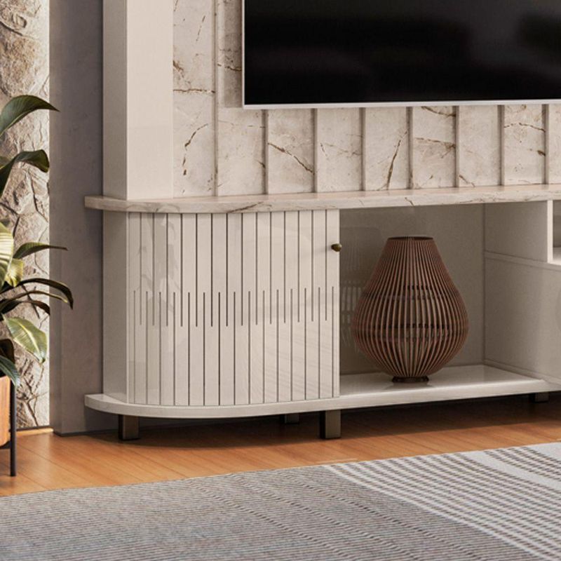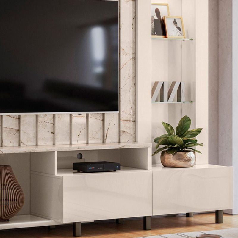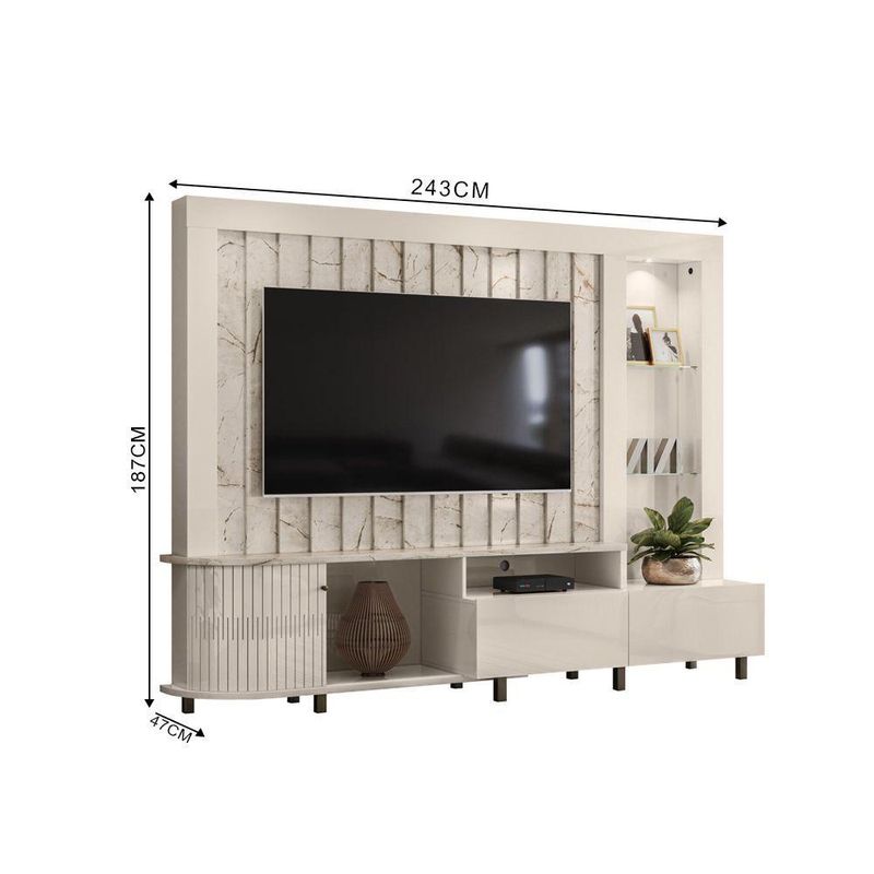 Estante De Tv 70 Pol 243cm Ripado Sala De Estar Nivora Calacata/off White M20 - D'rossiA Estante de TV Nivora na Calacata/Off White é a opção perfeita para quem deseja unir design contemporâneo, organização inteligente e acabamento sofisticado na Sala de Estar. Com largura de 243cm, o móvel suporta TVs de até 70 polegadas, transformando o ambiente em um espaço elegante e funcional. Produzida com chapas em MDP de 15mm e 25mm, oferece excelente durabilidade e resistência ao longo do tempo. O destaque fica por conta da porta deslizante flexível em MDF, com design curvo exclusivo, que proporciona um visual diferenciado e otimiza o uso do espaço. A iluminação LED integrada valoriza objetos decorativos e cria uma atmosfera aconchegante. As prateleiras de vidro de 5mm adicionam leveza e requinte, enquanto o nicho central é ideal para aparelhos eletrônicos. Para completar, o móvel conta com duas gavetas com corrediças telescópicas, que garantem organização prática e eficiente. Os pés em poliestireno garantem estabilidade e ainda contribuem para a praticidade na hora da limpeza. O puxador em tom cromado, por sua vez, acrescenta um toque de sofisticação ao design. Dimensões do Produto: Altura: 187 cm Largura: 243 cm Profundidade: 47 cm Peso: 98 kg Características do Produto: Material da Estrutura: MDP e MDF Espessuras das Chapas: 15mm/25mm Peso Suportado: 43 Kg Distribuídos Acabamento: Pintura UV Escala de Brilho: Brilho/Fosco Suporta TV de até: 70 Polegadas Possui Prateleiras: Sim Quantidade de Prateleiras: 2 Prateleiras Material das Prateleiras: Vidro 5mm Possui Portas: Sim Quantidade de Portas: 1 Porta Material da Porta: MDF Tipo Porta: Deslizante Possui Nichos: Sim Quantidade de Nichos: 1 Nicho Possui Gavetas: Sim Quantidade de Gavetas: 2 Gavetas Material das Corrediças: Telescópicas Possui Puxador: Sim Quantidade de Puxador: 1 Puxador Material do Puxador: Poliestireno cromado Possui Pés: Sim Material dos Pés: Poliestireno Possui Luminária de LED: Sim Possui Espelho: Não possui Possui Rodízios: Não possui Diferenciais: Design moderno; Detalhes curvos no tampo e na base; Porta deslizante flexível, Painel com detalhe ripado. Sistema de montagem: Cavilhas/Parafusos/Minifix Manual de Montagem: Sim Complexidade da Montagem: Alta Montagem: Recomendamos que seja feita por um profissional Garantia: 90 dias contra defeito de fabricação Instruções de Limpeza: Utilizar um pano limpo e levemente úmido Quantidade de Volumes 3 Caixas Medida das Embalagens Caixa 1: 140x49,5x13,7cm; Caixa 2: 183,5x37x10cm; Caixa 3: 240,7x29,5x8,2cm Entrega: É feita somente até o térreo ou portaria. Confira sempre as medidas das embalagens para assegurar que o produto passe por portas e escadas do local.