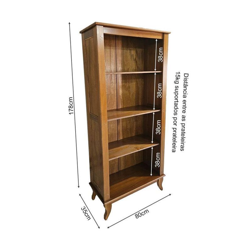Estante Livreiro De Madeira Antiga Sem Portas Luiz Xv CastanhoO Livreiro une estilo e funcionalidade, sendo perfeito para quem deseja manter seus livros e objetos favoritos sempre organizados e à mostra. Seu design contemporâneo acrescenta sofisticação ao ambiente, tornando-se um destaque na decoração.Ideal para salas, escritórios ou quartos, o móvel oferece amplo espaço nas prateleiras, valorizando tanto a estética quanto a praticidade do dia a dia.CaracterísticasTipo: LivreiroCor: CastanhoMaterial: Madeira MaciçaNão possui portasDimensões do ProdutoAltura: 173 cmLargura: 80 cmProfundidade: 35 cmObservações ImportantesMontagem: Produto entregue desmontado. Recomenda-se a contratação de um profissional para a montagem.Limpeza: Utilize pano levemente umedecido, evitando produtos abrasivos.Decorações: Os objetos decorativos NÃO acompanham o produto.ATENÇÃOAS IMAGENS SÃO MERAMENTE ILUSTRATIVAS E PODEM APRESENTAR VARIAÇÕES DE COR E PEQUENOS DETALHES DE ACORDO COM O SEU MONITOR, ILUMINAÇÃO DO AMBIENTE E PERCEPÇÃO VISUAL.Estante Livreiro de Madeira Antiga sem Portas Luiz Xv Castanho