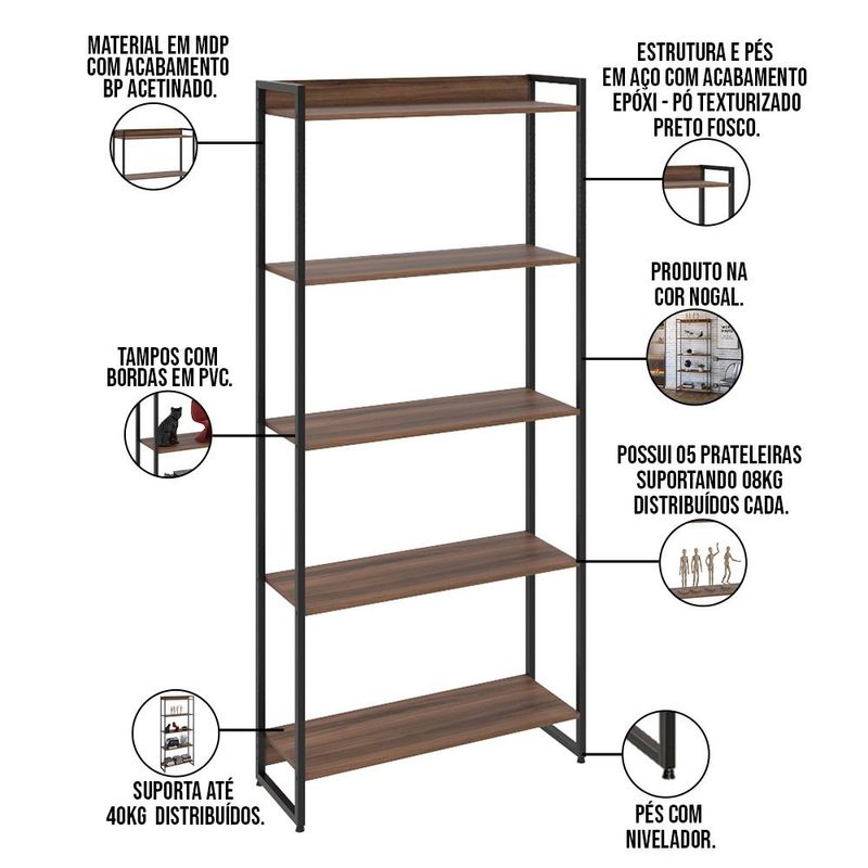 Com a Estante Multiuso Para Escritório Industrial 05 Prateleiras Areta 186x80cm C01 Nogal - Lyam Decor, o conceito industrial ficará evidente no seu ambiente, tornando o mesmo muito mais moderno, sofisticado e organizado, garantindo isso com 05 prateleiras que deixam tudo prático e funcional. Uma característica muito forte dos móveis industriais é a união do tubular de estrutura exposta com a madeira, que dão todo o charme para agregar no estilo que está entre os mais buscados no ramo de arquitetura e decoração. Dimensões do produto (L x A x P) 80 x 186 x 30 cm Medidas Internas: Altura da prateleira: 39,7cm Largura da prateleira: 76cm Características: 05 prateleiras produzidas em MDP , com acabamento em BP acetinado. Pés em tubo de aço com sapatas niveladoras e acabamento em pintura texturizada epóxi, responsável por criar alta resistência á umidade e produtos químicos, facilitando também na limpeza e manutenção. Fita de borda em PVC. Solda com acabamento suavizado. Produto na cor Nogal. Suporta até 8 kg por prateleira. Produto entregue desmontado, acompanha manual de montagem. Para a limpeza, utilize flanela seca. Evite contato com produtos químicos (solventes, thinner, acetona, etc) e não utilize nenhum tipo de esponja de aço. Observações importantes: A montagem será de responsabilidade do comprador; Responsabilizamo-nos pela entrega em todo território nacional, até onde as rodovias alcançam, entregas fluviais ou aéreas devem ser cotadas a parte; As imagens são ilustrativas, não acompanham objetos de decoração e eletrônicos; Não nos responsabilizamos, no ato da entrega, por subir escadas/elevadores ou transporte por guincho em apartamentos. Eventuais despesas são de responsabilidade do comprador; Confira as dimensões do produto e certifique-se de que passará normalmente por supostos elevadores, portas, escadas e/ou corredores de sua residência;