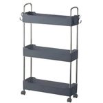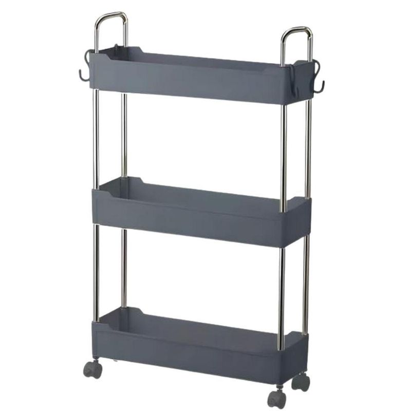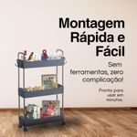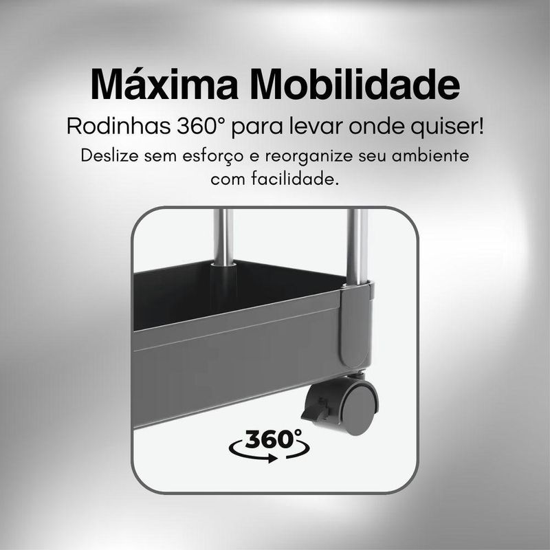 Estante Organizadora Móvel 3 Andares Para Cozinha, Banheiro E EscritóriosOrganize seus ambientes com a Estante Organizadora Móvel de 3 andares na cor cinza, perfeita para cozinhas, banheiros, lavanderias e escritórios.- Design moderno e atrativo, com acabamento em cinza e detalhes em inox.- Estrutura robusta em plástico PP branco e hastes de sustentação em aço inox, garantindo durabilidade.- Rodinhas giratórias em 360°, facilitando a movimentação e a reorganização do espaço conforme necessário.- Dimensões compactas: 62 cm de altura, 12 cm de largura e 40 cm de comprimento, ideal para otimizar qualquer área.- Montagem simples e rápida, proporcionando facilidade na instalação.- Produto com registro INMETRO, assegurando qualidade e segurança conforme padrões regulamentares.- Código NCM: 9403.70.00.Mantenha sua casa ou escritório organizado de forma prática e estilosa com esta estante versátil e funcional.Estante Organizadora Móvel 3 Andares para Cozinha, Banheiro e Escritórios