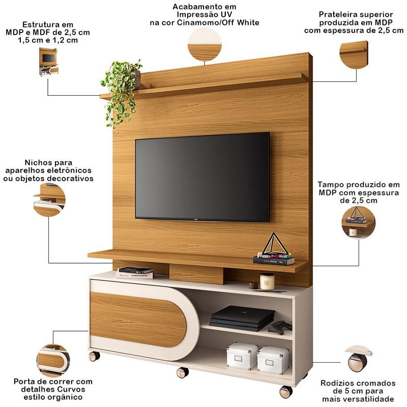 Estante Painel Mars, da Lyam Decor: estilo e funcionalidade em ambientes compactos. Com a estante Mars, você terá a solução perfeita para elevar o estilo da sala de estar pequena sem abrir mão da funcionalidade. Com um design que acomoda TVs de até 55 polegadas, a esse home theater é compacto e cheio de charme. A porta de correr com design curvo remete ao estilo orgânico, trazendo suavidade e elegância ao ambiente, enquanto os rodízios conferem versatilidade, permitindo que você reorganize o espaço com facilidade e praticidade. Transforme sua sala em um refúgio acolhedor e moderno com a Estante Painel Mars, onde cada detalhe é pensado para maximizar seu estilo e conforto! Dimensões total do produto (L x A x P) 136 x 190 x 39 cm Características: Estrutura em MDP e MDF de 25 mm, 15 mm e 12mm. Peças na cor Off White em impressão UV Alto Brilho e peças na cor Cinamomo com acabamento em impressão UV Texturizada. Ideal para TVs de até 55 polegadas. 01 Porta de correr com detalhes curvos, estilo orgânico. Nichos para aparelhos eletrônicos ou objetos decorativos. Prateleira superior e tampo produzidos em MDP com espessura de 25 mm. Rodízios cromados de 50mm para mais versatilidade. Suporta até 40 kg distribuídos. - Produto entregue desmontado, acompanha manual de montagem. Sistema de montagem: Girofix, Cavilhas e Parafusos. - Este produto deve ser limpo com pano macio e seco. Não utilize produtos abrasivos como álcool e detergente, assim como esponjas rígidas ou palha de aço. - Proteja a superfície do móvel de objetos que transmitam calor ou umidade. Observações importantes: - Produto para uso residencial em ambiente interno, não devendo ficar exposto diretamente ao sol, calor e umidade excessivos. - Pode haver alguma diferença de tonalidade entre a imagem e o produto real, por conta do tratamento de imagens e a calibração de cores do seu monitor. - As imagens são meramente ilustrativas, não acompanham objetos de decoração e eletrônicos. - Ao receber a mercadoria, o cliente deve verificar as condições da embalagem, caso haja alguma avaria não assine o comprovante de recebimento. - Montagem, desmontagem e outras instalações serão de responsabilidade do cliente. Não nos responsabilizamos, no ato da entrega, por subir escadas/elevadores ou pelo transporte por guincho em apartamentos. Eventuais despesas são de responsabilidade do comprador. - Confira as dimensões do produto e certifique-se de que passará normalmente por supostos elevadores, portas, escadas e/ou corredores de sua residência.