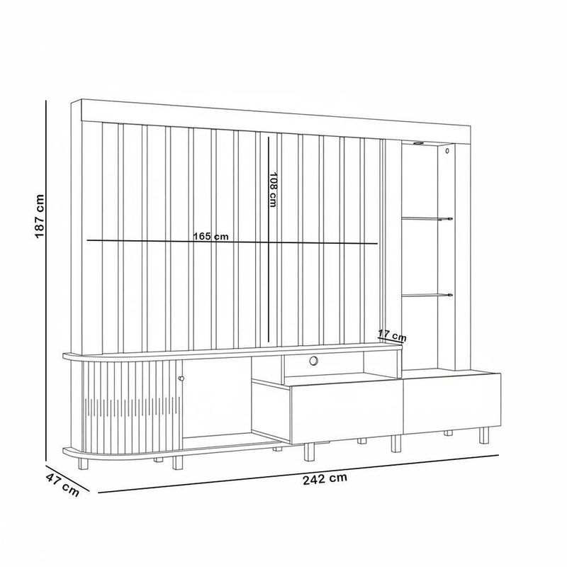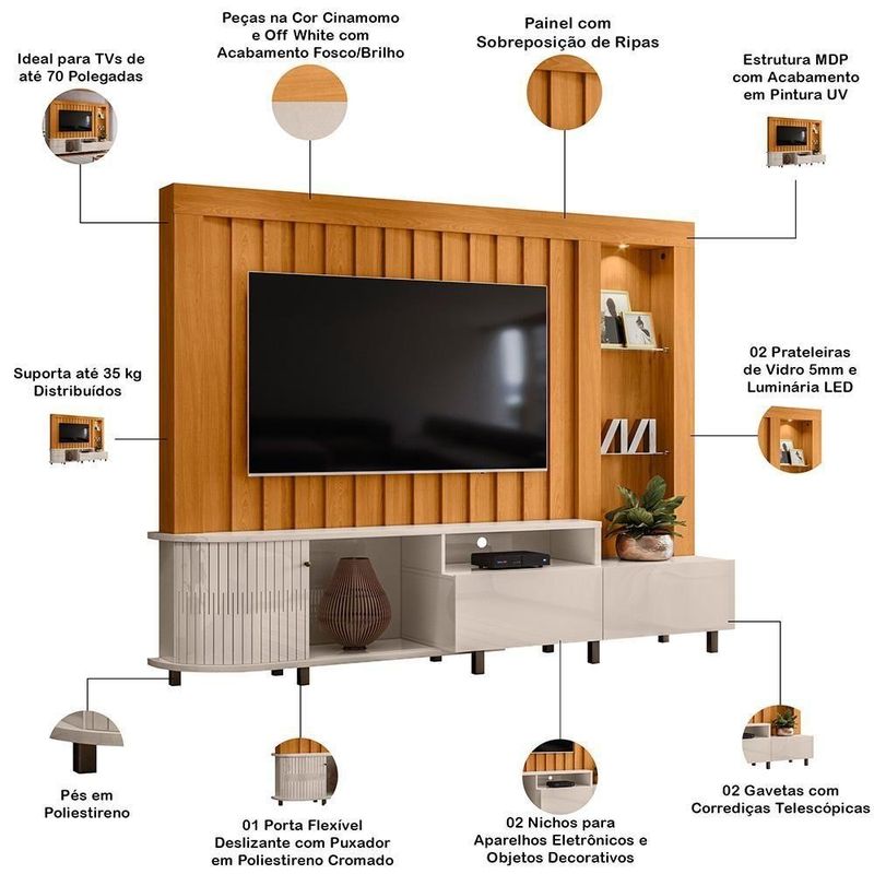 Estante Painel Para Tv 70 Pol Com Led 242cm Hector M07 Cinamomo Off White - Lyam DecorTenha tudo no lugar, com um toque de luz! A Estante Painel Hector é a solução completa para quem precisa de espaço e organização na sala de estar.Desenvolvida com 2 gavetas e 1 porta flexível, com essa estante para sala você organiza tudo de forma rápida e fácil, sempre com acesso prático. Além disso, as prateleiras de vidro e a luminária de LED criam um visual decorativo incrível, enquanto os detalhes curvos adicionam o charme do estilo orgânico. Por fim, o painel suporta TVs de até 70 polegadas, o que deixa o ambiente ainda mais imponente. Enfim, praticidade e beleza, finalmente unidas, expressas pela Estante Home Hector. Você vai se surpreender! Dimensões do produto (L x A x P) 242 x 187 x 47 cm. Medidas Internas Espaço livre para a TV (L x A x P): 165 x 108 x 17 cm. Características do produto: Estrutura MDP com acabamento em pintura UV. Peças na tonalidade Cinamomo e Off White com acabamento fosco/brilho. Ideal para TVs de até 70 polegadas. 01 porta flexível deslizante com puxador em poliestireno cromado. 02 gavetas com corrediças telescópicas. 02 Nichos para aparelhos eletrônicos e objetos decorativos. 02 prateleiras de vidro 5mm e luminária LED. Painel com sobreposição de ripas. Pés em poliestireno. Suporta até 35 kg distribuídos. - Produtos entregues desmontados, acompanha manual de montagem. Sistema de montagem: Parafusos, cavilhas, girofix. - Este produto deve ser limpo com pano macio e seco. Não utilize produtos abrasivos como álcool e detergente, assim como esponjas rígidas ou palha de aço. - Proteja a superfície do móvel de objetos que transmitam calor ou umidade. Observações importantes: - Produto para uso residencial em ambiente interno, não devendo ficar exposto diretamente ao sol, calor e umidade excessivos. - Pode haver alguma diferença de tonalidade entre a imagem e o produto real, por conta do tratamento de imagens e a calibração de cores do seu monitor. - As imagens são meramente ilustrativas, não acompanham objetos de decoração e eletrônicos. - Ao receber a mercadoria, o cliente deve verificar as condições da embalagem, caso haja alguma avaria não assine o comprovante de recebimento. - Montagem, desmontagem e outras instalações serão de responsabilidade do cliente. Não nos responsabilizamos, no ato da entrega, por subir escadas/elevadores ou pelo transporte por guincho em apartamentos. Eventuais despesas são de responsabilidade do comprador. - Confira as dimensões do produto e certifique-se de que passará normalmente por supostos elevadores, portas, escadas e/ou corredores de sua residência. Material das corrediças: Metálicas Telescópicas | Largura: 242 cm | Material da estrutura: MDP | Tamanho máximo de TV: 70 Polegadas | Peso: 97 kg | Quantidade de prateleiras: 2 | Formato do móvel: Estante Home Theater | Color: Cinamomo Off White | ColorFamily: Marrom | ColorSimple: Marrom | ColorSupplier: Cinamomo Off White | MaterialFamily: MDP | OriginCountry: Nacional | OriginState: PR | ProductContents: 01 Estante Home Theater | ProductHeight: 187 cm | ProductLength: 47 cm | ProductWeight: 97 kg | ProductWidth: 242 cm | SizeDescription: Largura: 242 cm x Altura: 187 cm x Profundidade: 47 cm | SupplierSimpleName: Estante Painel Para TV 70 Pol Com LED 242cm Hector M07 Cinamomo Off White - Lyam Decor | Material: MDP | Altura: 187 cm | Com compartimento para alto-falantes: Não | Quantidade de gavetas: 1 | Requer montagem: Sim | Quantidade de portas: 1 | ProductWarranty: 90 dias após o recebimento do produto | Com rodas: Não | Materiais do corpo: MDP | ProductInstructions: Produto para uso em ambiente interno, nao devendo ficar exposto ao sol, calor e umidade excessivos. | Profundidade: 47 cm | Cinamomo Off White