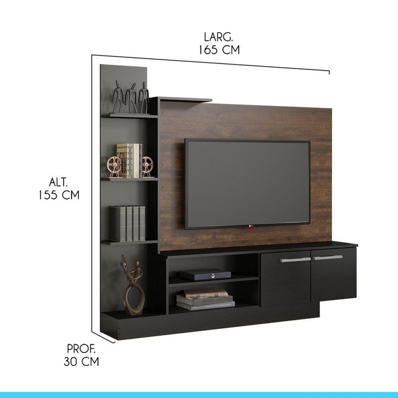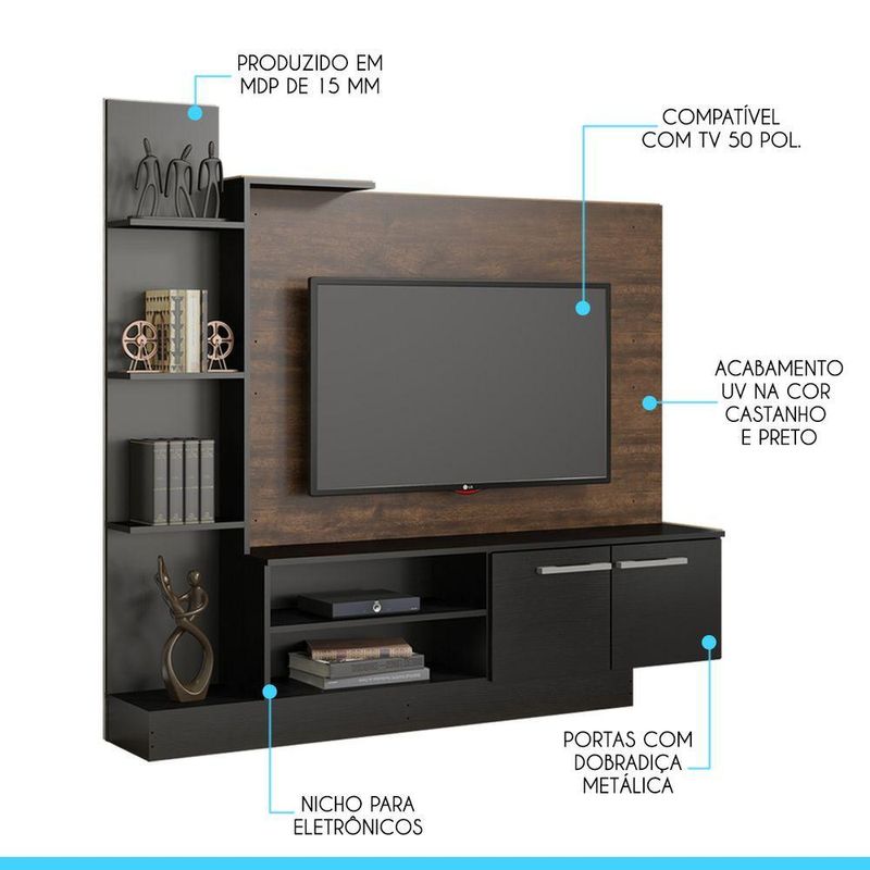 Estante Para Tv 50 Polegadas Com 2 Portas E Nichos Menu Móveis CastanhoQuer deixar sua sala mais completa e elegante? Então invista agora no Home TV Cairo. Com um design atual e super funcional, ele vai transformar a decoração do seu ambiente. Possui nichos para eletrônicos, prateleira para decoração e duas portas para manter tudo sempre organizado. Produzido com materiais de excelente qualidade, garantindo a sua resistência e mantendo sua beleza e funcionalidade por muito mais tempo. O melhor em móveis no design atual aliando conforto, qualidade e ótimos preços, só na Menu Móveis!CARACTERÍSTICAS TÉCNICAS:- Produzido em MDP de 15 mm- Acabamento UV na cor Castanho e Preto- Portas com Dobradiça Metálica- Puxadores Alça em ABS na cor Cromado*Compatível com TV até 50 Pol.INFORMAÇÕES TÉCNICAS:Altura: 155 cmLargura: 165 cmProfundidade: 30 cmPeso: 40,5 kgINFORMAÇÕES ADICIONAIS:*ATENÇÃO: Não trabalhamos e não nos responsabilizamos pela montagem do móvel. Antes da montagem conferir se o produto está de acordo com o que comprou, produto montado e danificado pela montagem não será aceito troca.**As imagens ambientadas são meramente ilustrativas e podem apresentar itens que não compõe o produto. As cores do produto podem variar de acordo com o monitor, a iluminação do ambiente ou sua percepção visual.***Limpeza: Deve ser feita com pano macio e seco ou levemente umedecido com água e sabão neutro. Não devem ser utilizados abrasivos como palha de aço e objetos cortantes. Garantia para defeitos de fabricação conforme Código de Defesa do Consumidor.Menu Móveis