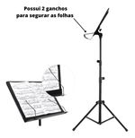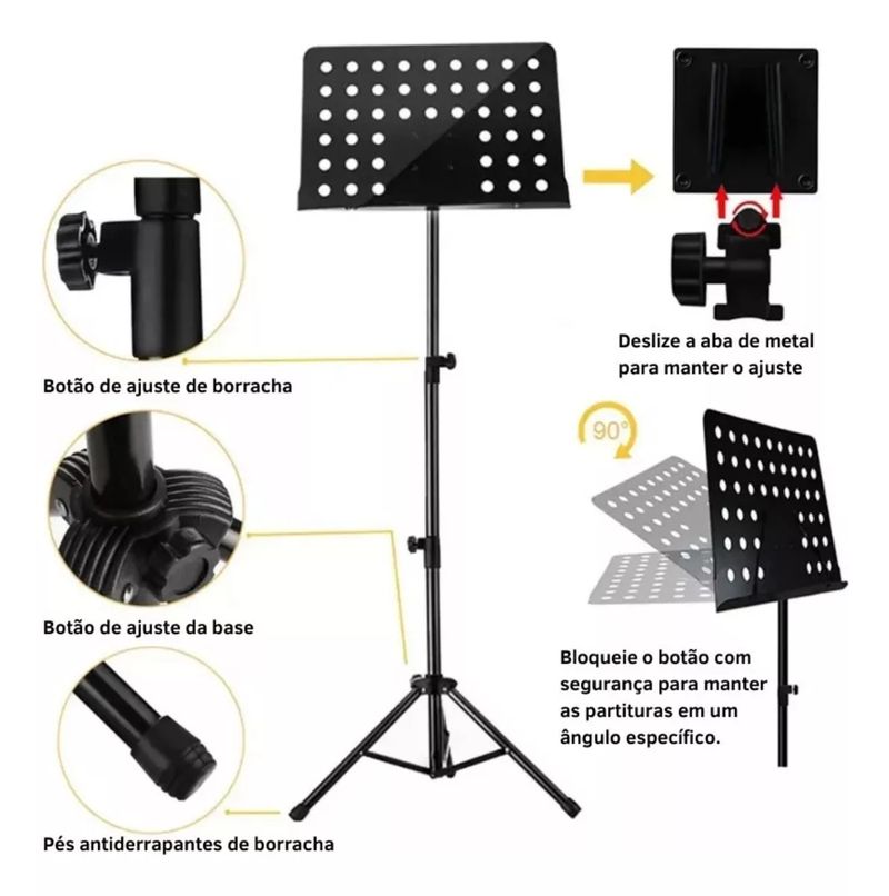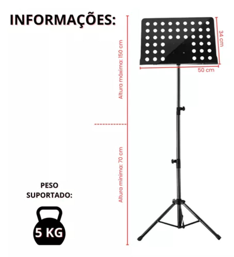 Estante Partitura Maestro Reforçada Púlpitos Pastas LivrosSuporte Estante PartituraCor Disponível:• PretoEspecificações Técnicas:• Principal material de fabricação: Metal.• Pintura eletrostática e tratamento antiferrugem.• Bases emborrachadas para maior aderência e antiderrapantes.• Articulável para fácil transporte.• Modelo possui sistema de fixação das folhas com molas que não permitem que o vento mude a página.Com design compacto e moderno, o suporte estante partitura é discreto e portátil, ideal para seus ensaios e transporte.Medidas da Prancheta:- 34 cm de Altura- 50 cm de Comprimento- 04 cm da base de apoioDimensões Pedestal:Altura máxima: 150 cmAltura mínima: 70 cmConteúdo da Embalagem:• 01 Suporte Estante PartituraEstamos à disposição para ajudá-lo em qualquer dúvida relacionada ao produto. Sinta-se à vontade para nos perguntar!Garantia do vendedor: 3 meses