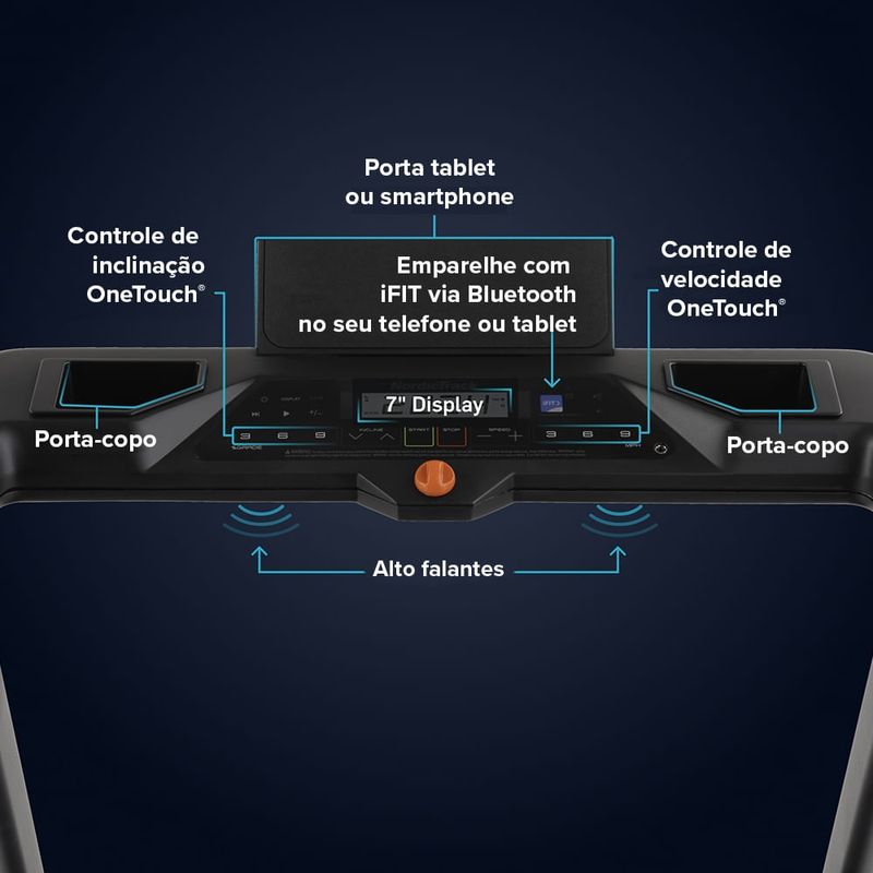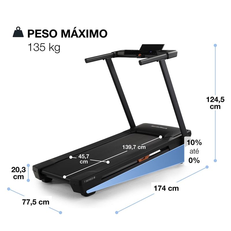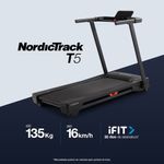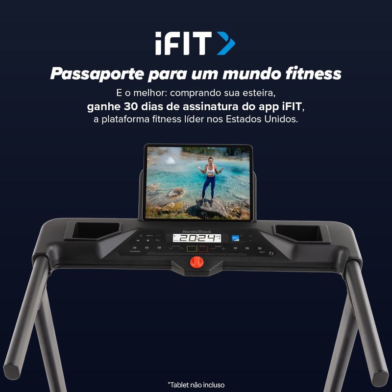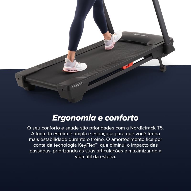 Esteira Nordictrack T5O melhor das academias dentro da sua casaTreine com muito mais intensidade e usando a tecnologia a seu favor sem sair de casa. Conheça a Nordictrack T5, a esteira semiprofissional perfeita para o uso residencial.E o melhor: compre a sua esteira e ganhe 30 dias de assinatura do app iFIT, a plataforma fitness líder nos Estados Unidos. Com o iFIT, você conecta a Nordictrack T5 e faz rotas de treinos por todo o mundo, acompanhado por um personal trainer durante o percurso.Integração completaA esteira Nordictrack T5 tem suporte para tablet ou smartphone e é compatível com o SmartAdjust™ e o monitoramento detalhado ActivePulse™, ambas funções integradas ao iFIT.Os seus treinos serão muito mais imersivos com o ajuste automático de velocidade e inclinação de acordo com o exercício escolhido.Corridas, caminhadas, trilhas e muito mais! Percorra o mundo do conforto da sua casa e monitore todos os seus dados vitais com a sua nova esteira.Passaporte para um mundo fitnessNo seu pique!A Nordictrack T5 tem potência de sobra para acompanhar o ritmo do seu treino. Com um motor de 2.6 CHP, ela mantém inclinação e velocidade constantes pelo tempo que você quiser.Ergonomia e confortoO seu conforto e saúde são prioridades. A lona da esteira é ampla e espaçosa para que você tenha mais estabilidade durante o treino. O amortecimento fica por conta da tecnologia KeyFlex™, que diminui o impacto das passadas, priorizando as suas articulações e maximizando a vida útil da esteira.Praticidade para a sua rotinaAcompanhe com facilidade todas as informações importantes, como tempo, distância, calorias e muito mais durante o seu exercício pelo display de LCD integrado à esteira.Configure como quiser sem parar de correr! Com as teclas Smart Quick, tudo o que você precisa está a apenas um toque de distância.Além da velocidade, a inclinação da esteira também pode ser ajustada digitalmente em até 10%.FAQQuais as vantagens de ter uma esteira semiprofissional em casa?Ter uma esteira semiprofissional em casa alia o melhor da tecnologia fitness com o seu treino, reduzindo as dificuldades e impedimentos para praticar exercícios. Treinar em casa permite que você respeite o seu tempo e resistência, priorizando a saúde.O que é o iFIT?O iFIT é a plataforma líder da categoria Fitness Inteligente nos Estados Unidos. Com a assinatura iFit, você tem acesso a mais de 10 mil modelos de treino, alguns deles criados por atletas profissionais, medalhistas olímpicos e campeões mundiais. Além disso, você pode treinar de maneira interativa em cenários incríveis, com ajustes automáticos de inclinação de acordo com o terreno.Como conectar o celular ao iFIT?Basta baixar o aplicativo no seu celular. Ele está disponível para smartphones tanto na App Store quanto no Google Play.Imagens Meramente Ilustrativas.