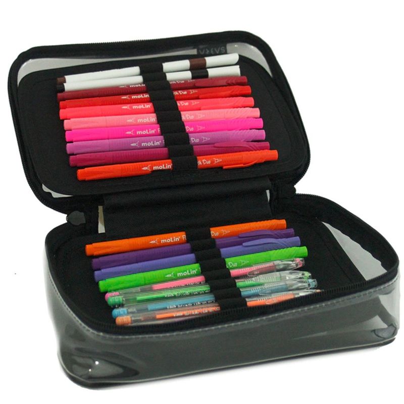 ESTOJO BOX 100 PENS CRISTAL PRETO LISO - SABRA Conheça o Box 100 Pens Cristal Preto!Ah, o Box 100 Pens Cristal Preto! O estojo que vai transformar sua vida escolar em uma verdadeira obra-prima da organização! Se você é aquele estudante que vive perdendo canetas ou se perguntando onde foi parar a borracha, chegou a hora de dizer adeus ao caos!Praticidade e Estilo em Um Só Estojo:Imagina ter um estojo tão resistente e espaçoso que até seu professor vai ficar com inveja? O Box 100 Pens é a união perfeita de praticidade e estilo. Com duas divisórias internas, você pode separar suas canetas das outras tralhas que você insiste em carregar. E o melhor: tudo isso com um fechamento com zíper – porque sabemos que a vida é curta demais para estojo que não fecha!Especificações Técnicas: Dimensões: 23cm X 17cm X 6cmMaterial: Tecido PVC cristal (dá até para ver o que tem lá dentro!)Divisórias: Duas, porque uma só não é suficiente!Fechamento: Zíper e cursor – segurança total!E não para por aí! Seja na escola, na faculdade ou em casa, ele vai ser seu melhor amigo na missão de manter tudo organizado.Se você quer unir o útil ao agradável e ainda dar um toque de estilo ao seu material escolar, o Box 100 Pens Cristal Preto é a escolha perfeita! Não perca tempo e confira todos os detalhes e cores disponíveis. Seu futuro eu vai agradecer por essa compra!