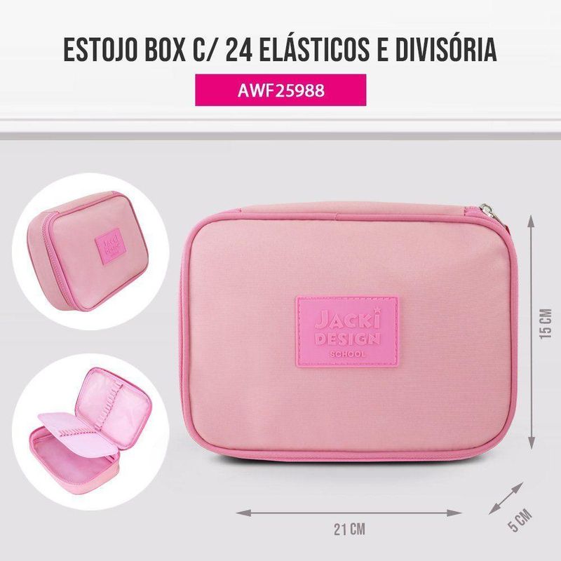 Estojo Box Organizador Escolar Com Divisórias E 24 ElásticosEstojo Box Organizador Escolar com Divisórias e 24 Elásticos - Organização prática para canetas e materiais escolares, com amplo espaço, divisória interna e design modernoEstojo Box Organizador Escolar com Divisórias – 24 Elásticos | Jacki DesignOrganização, praticidade e estilo no seu dia a dia!O Estojo Box da Jacki Design foi desenvolvido para quem busca manter lápis, canetas e acessórios sempre arrumados e de fácil acesso. Com design moderno e estrutura reforçada, ele é perfeito para escola, faculdade, escritório ou para quem ama itens de papelaria bem organizados.Fabricado em microfibra de alta qualidade, o estojo é resistente, leve e fácil de limpar. Possui divisória interna, 24 elásticos organizadores e amplo espaço para acomodar até 100 canetas, além de marcadores, borrachas, post-its, régua pequena e outros acessórios.Sua estampa lisa com bordas coloridas e tag emborrachada da Jacki Design garantem um visual moderno, enquanto o zíper grande e durável oferece abertura prática e segura. O interior é totalmente forrado, aumentando a proteção dos seus materiais.Complete seu kit com outros produtos da coleção Jacki Design e deixe sua rotina ainda mais organizada!Diferenciais do ProdutoMaterial resistente em microfibra premiumComporta até 100 canetas24 elásticos organizadores para lápis, canetas e marcadoresDivisória interna para melhor organizaçãoDesign moderno com bordas coloridasTag emborrachada da marcaEstojo totalmente forrado por dentroZíper grande e reforçadoLeve, prático e multifuncionalEspecificaçõesMaterial: MicrofibraMedidas: Comprimento: 21 cm x Profundidade: 15 cm x Altura: 5 cmAcompanha o produto: - 1 - Estojo