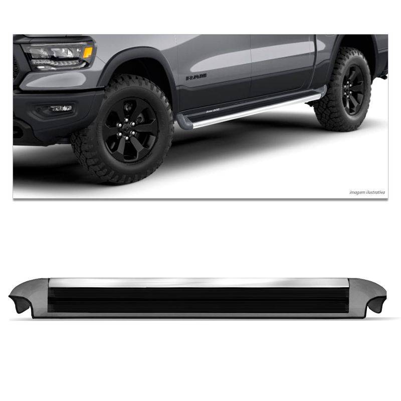 Estribo Lateral Personalizado Dodge Ram 1500 2021 a 2025 Prata Billet - Personal O Estribo Personalizado foi desenvolvido especialmente para seu Dodge Ram 1500, tendo como finalidade proporcionar ao seu veículo um visual mais robusto e elegante. Não deixando de lado a proteção que oferece contra detritos lançados pelos pneus. Além de possuir em seu pisante borracha antiderrapante para maior segurança e melhor auxiliar na entrada e saída do motorista e dos passageiros. Acompanha adesivo em resina de alto-relevo com o nome do veículo trazendo mais beleza á peça. Fabricado em Aço carbono de alta qualidade e resistência e com ponteiras em plástico injetado ABS, com pintura automotiva na cor Prata Billet de alto padrão, acabamento lateral cromado em aço inox. Estribo fixado nas furações originais, não havendo necessidade de novas furações, assim preserva a originalidade de seu Ram 1500 e garante o melhor custo-benefício do mercado de acessórios automotivos. Especificações Técnicas: Adesivo Resinado com o nome do veículo Ponteiras em plástico injetado ABS Completo com kit de instalação Produto na cor Prata Billet Acabamento em Inox cromado Design elegante e moderno Fabricado em aço carbono Pisante antiderrapante Fabricado em Alumínio Tabela de Aplicação: Dodge Ram 1500 2021 Ram 1500 2022 Ram 1500 2023 Ram 1500 2024 Ram 1500 2025 Compatível com todas as versões.