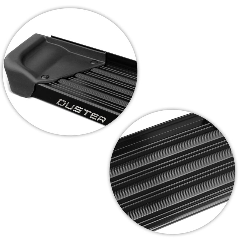 Estribo Lateral Duster 2012 a 2025 Aluminio Preto A3 - Gtnox O Estribo Plataforma GTNOX A3 é um acessório instalado na lateral do veículo, tendo como objetivo auxiliar na entrada e saída do motorista e dos passageiros, outra característica importante é seu design moderno e esportivo, pois proporciona um visual ainda mais completo para sua Pick up. Desenvolvido pela GTNOX, fabricante com referência nacional pela sua qualidade em fabricação de acessórios automotivos de alto padrão. Fabricado em alumínio na cor preta com capacidade máxima suportada de até 100kg para subida, o estribo também acompanha pisante antiderrapante e possui também ponteiras injetadas em plástico ABS, concedendo ainda mais beleza à peça em toda sua extensão a fim de garantir maior segurança ao pisar. Projetou o estribo de maneira que seja necessário a realização de furos para a fixação do produto, a fim de garantir o melhor custo-benefício do mercado de acessórios automotivos. Especificações Técnicas: Capacidade de até 100 kg distribuídos Ponteira injetada em Plástico ABS Acabamento lateral em alumínio Completo com kit de instalação Design moderno e esportivo Pisante antiderrapante Fabricado em alumínio Estribo na cor Preta Precisa de Furações Tabela de Aplicação: Duster 2012 Duster 2013 Duster 2014 Duster 2015 Duster 2016 Duster 2017 Duster 2018 Duster 2019 Duster 2020 Duster 2021 Duster 2022 Duster 2023 Duster 2024 Duster 2025 Compatível com todas as versões.