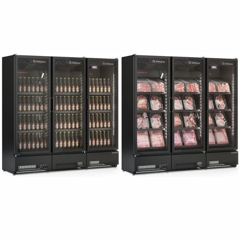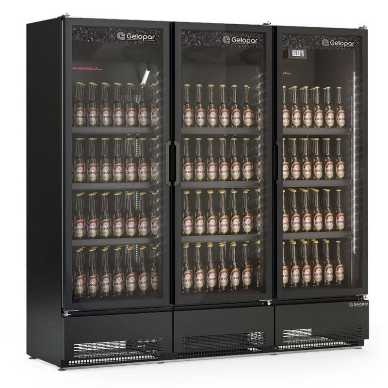 Expositor Vertical Linha Carbono 3 Portas De Vidro Gcbc1450cb Gelopar Refrigerador 1468 Litros All Black 220vRefrigerador Vertical Linha Conveniência Carbono 1468L GCBC1450CB Gelopar. Conservação e exposição de bebidas, frios e laticínios. Temperatura regulável: -6°, -4°, +1°C ou +3°C (Modo Economia). Refrigeração: Ar forçado com evaporador aletado. Controlador eletrônico com indicador de temperatura. Degelo: Manual. Iluminação: LED (interna) perimetral vertical, com interruptor. Porta: Vidro duplo temperado baixo emissivo, com serigrafia e perfil slim. Fechamento automático. Carenagem inferior em aço pré-pintado preto. Prateleiras aramadas: 4 níveis reguláveis e inclináveis. Revestimento: Interno e externo em aço pré-pintado preto. Pés niveladores. Perfil porta etiquetas. CAPACIDADE: 1468L. ARMAZENAGEM: 1350 Latas 350ml, 750 Long necks 350ml ou 492 Garrafas 600ml. CONSUMO: 18,4kWh/dia. PESO 181kg. DIMENSÕES(CxAxL): 195x196,2x64cm. Equipamento certificado conforme Portaria Inmetro nº 371/2009. Refrigerador Vertical Linha Conveniência Carbono 1468L GCBC1450CB Gelopar é na Atau.Marca - GeloparModelo - GCBC1450CBCapacidade - 1468 LitrosFrente - 195cmAltura - 196,2cmProfundidade - 64cmTemperatura - -6°, -4°, +1°C ou +3°C (Modo Economia)Peso - 181kgConsumo - 18,4kWh/diaPortas - 3 PortasPrateleiras - 4