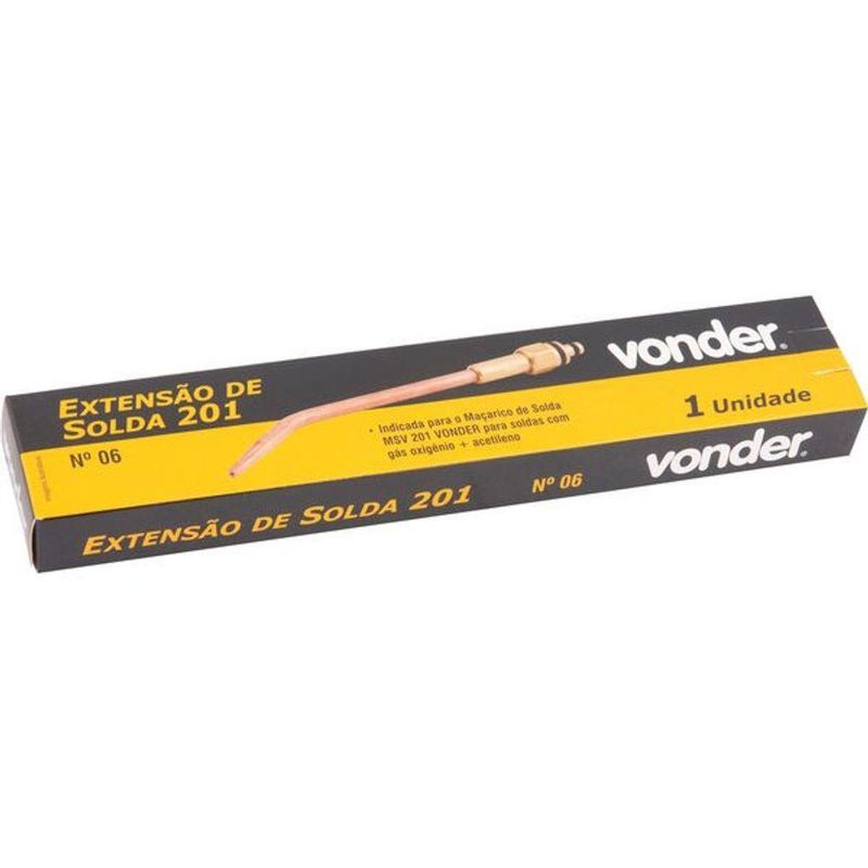 Extensão De Solda 201 N-06 - VonderConteúdo da embalagem1 Extensão de soldaAplicações e dicas de usoIndicada para o maçarico de solda MSV 201 Vonder para soldas com gás oxigênio+acetilenoDestaques e diferenciaisFabricada em cobre eletrolítico, proporcionando maior durabilidade, efetua a mistura dos gases internamente (injetor integrado). Atende às exigências das normas EN 5172 / NR18.DETALHES TÉCNICOS Número da extensão de solda: n° 06 Tipo de gás da extensão de solda: Oxigenio/acetileno Espessura de soldagem da extensão de solda: 0,8 mm - 1,5 mm Produto: Extensão