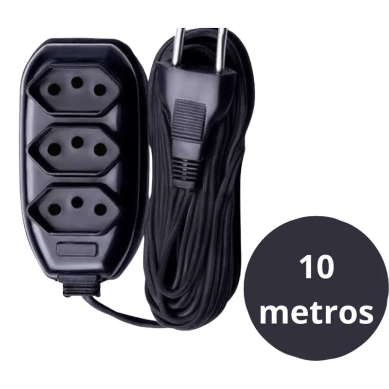 Extensão Elétrica 3 Tomadas 10 Metros Cor Preto BivoltEsta extensão elétrica oferece a solução ideal para conectar múltiplos aparelhos a longas distâncias, com segurança e praticidade. Compatível com redes de 127V e 220V (bivolt), ela é perfeita para uso residencial ou corporativo, garantindo flexibilidade no posicionamento dos seus equipamentos. Características de destaque incluem a capacidade de suportar até 10A de corrente máxima e um design durável com cabo paralelo ou PP resistente, dependendo do fabricante, que garante longevidade e desempenho confiável. A cor preta e o design compacto, como o da Extensão Slim Force Line, permitem uma integração discreta em diversos ambientes. CaracterísticasComprimento do cabo 10 metrosQuantidade de tomadas 3 tomadasTensão máxima suportada 250VCorrente máxima 10AModelo da tomada Bipolar (2 pinos) ou tripolar (2P+T, 3 pinos), conforme o fabricanteDesign otimizado Espaçamento ideal entre as tomadas para diferentes fontes Informações adicionaisMateriais Plástico e componentes metálicos (cobre e latão)Voltagem Bivolt (funciona em 127V e 220V)Potência máxima 1270W em 127V ou 2200W em 220VTipo de cabo Cabo paralelo ou cabo PPCompatibilidade Aparelhos com plugues de 2 ou 3 pinos (padrão brasileiro NBR 14136)Certificação Certificada conforme normas do Inmetro em muitos modelos