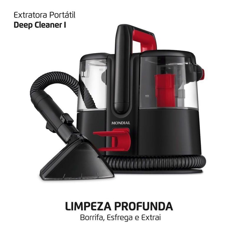 Extratora E Higienizadora Portátil Deep Cleaner I Mondial 1650W EXP-01-R 127V 60hzA Extratora Portátil Deep Cleaner I Mondial (EXP-01-R) oferece uma limpeza profunda com menos esforço e resultados de higienização eficazes. Com alta potência e diversos acessórios, ela é ideal para limpeza de estofados, tapetes, sofás, carros e outros tipos de superfícies.Principais Características:Limpeza Profunda: Proporciona uma limpeza eficaz ao borrifar, esfregar e extrair sujeiras difíceis, deixando as superfícies impecáveis.Potência de 1.650W: Potência para garantir uma excelente capacidade de sucção e maior eficiência na limpeza.Tanques Separados: Tanque de água limpa (1,5L) e tanque de água suja (750ml) facilitam o processo e aumentam a autonomia.Maior Alcance: Mangueira de 2 metros e cabo de 5,5 metros permitem alcançar áreas distantes sem interrupção.Função Pet Care: Facilita a remoção de pelos e sujeiras de animais de estimação, deixando o ambiente mais limpo e confortável.Acessórios Versáteis: Inclui três bicos extratores — grande, médio e pequeno — que permitem a limpeza de diferentes superfícies, com cerdas de silicone para tecidos delicados e um bico pequeno ideal para cantos.Design Portátil: Inclui alça de transporte e porta-fio para armazenamento prático e fácil manuseio.Itens Inclusos:1 Extratora e Higienizadora Portátil1 Bico Extrator Grande1 Bico Extrator Médio1 Bico Extrator Pequeno1 Mangueira de 2 metros1 Manual de InstruçõesEspecificações Técnicas:Modelo: EXP-01-RCor: Preto/VermelhoVoltagem: 127V/220VPotência: 1.650WTanque de Água Limpa: 1,5LTanque de Água Usada: 750mlTamanho do Cabo: 5,5 metrosTamanho da Mangueira: 2 metrosPeso: 3,50kgDimensões: 33,3cm x 32cm x 21cm (AxLxP)Garantia: 12 mesesMondial, a escolha inteligente!