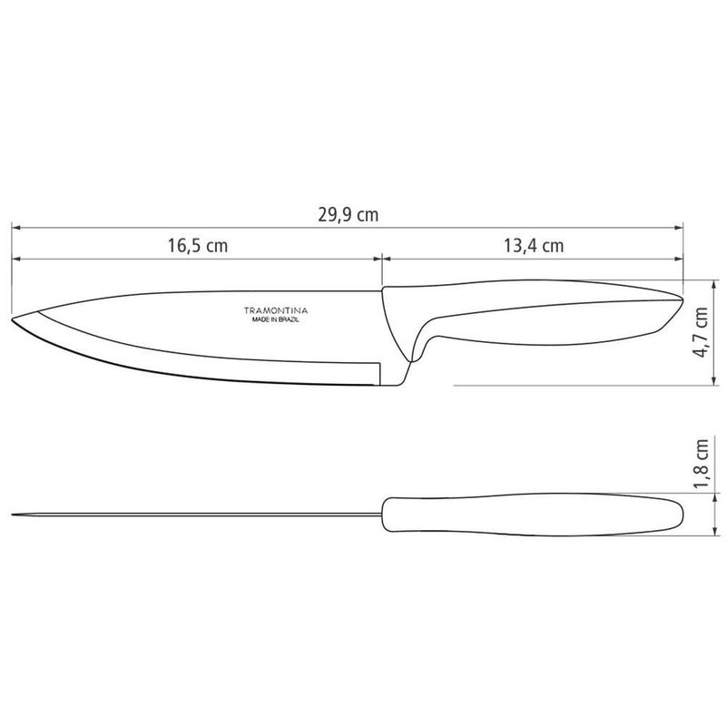 Quem ama cozinhar sabe que para o sucesso na confecção de pratos saborosos, os utensílios de cozinha precisam ser práticos, versáteis e de alta qualidade. Pensando nisso, a Tramontina desenvolveu essa incrível Faca Chef Plenus!Essa faca é essencial para diferentes funções em sua cozinha, dando um toque de Chef no preparo de suas receitas, pois conta com excelente lâmina de Aço Inox para garantir mais eficiência no corte de variados tipos de alimentos, desde peixe, frango, carnes bovina e suína, até frutas, legumes e verduras.A lâmina é rígida com excelente fio de corte para facilitar o uso em diferentes texturas, garantindo cortes precisos, seguros e mais eficientes. O cabo em Polipropileno é confortável e se encaixa perfeitamente nas mãos, além de ser leve e fácil de utilizar.Garanta agora mesmo mais praticidade para sua cozinha com a Tramontina!