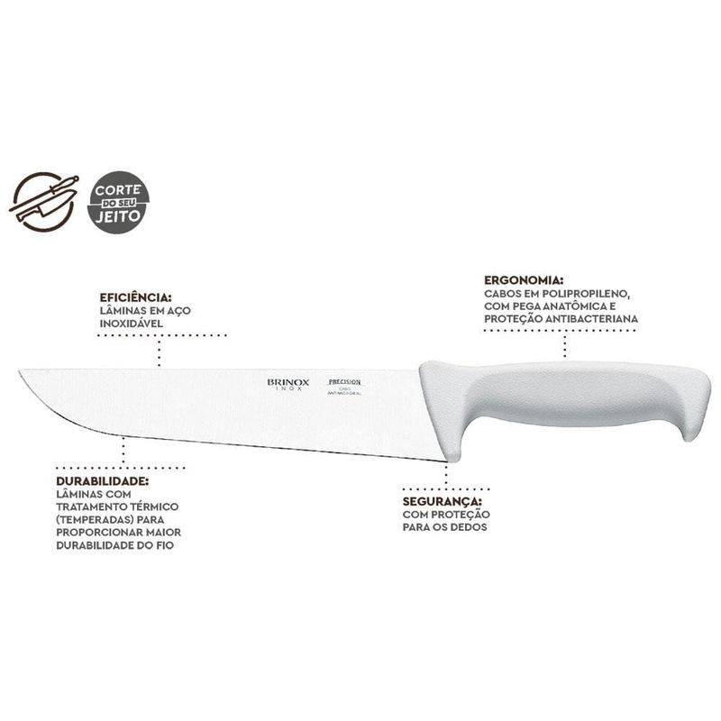 Com lâminas longa e fio aguçado a Faca 8" para Açougue Brinox Precision permite cortar e fatiar os mais diversos tipos de carne. A faca possui lâmina em aço especial, temperado e revenido, o que garante durabilidade e resistência. Seu cabo em polipropileno tem proteção antibacteriana, desenho ergonômico, é resistente e fácil de limpar.Perfeita para tornar o ato de cozinhar mais cômodo e seguro, garantindo que as suas receitas saiam precisamente como você planeja.Um utensílio de cozinha indispensável no dia a dia. Aproveite e garanta já a sua Faca da Brinox!